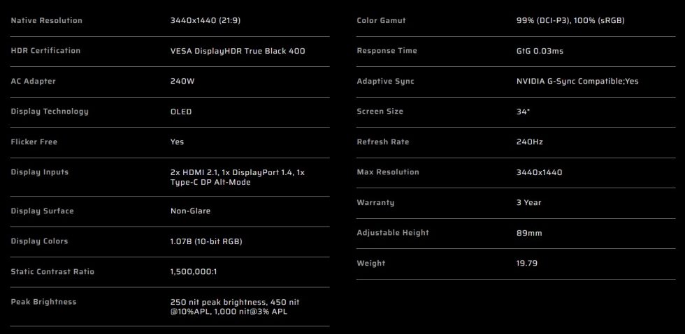 Apart from the 240 Hz refresh rate and the G-Sync Compatible certificate, the 34WQHD240-C doesn’t really differ from my Samsung Odyssey OLED G8. Let’s take a look at the ergonomics, the workmanship and the OSD before I unleash my measuring devices on the panel.