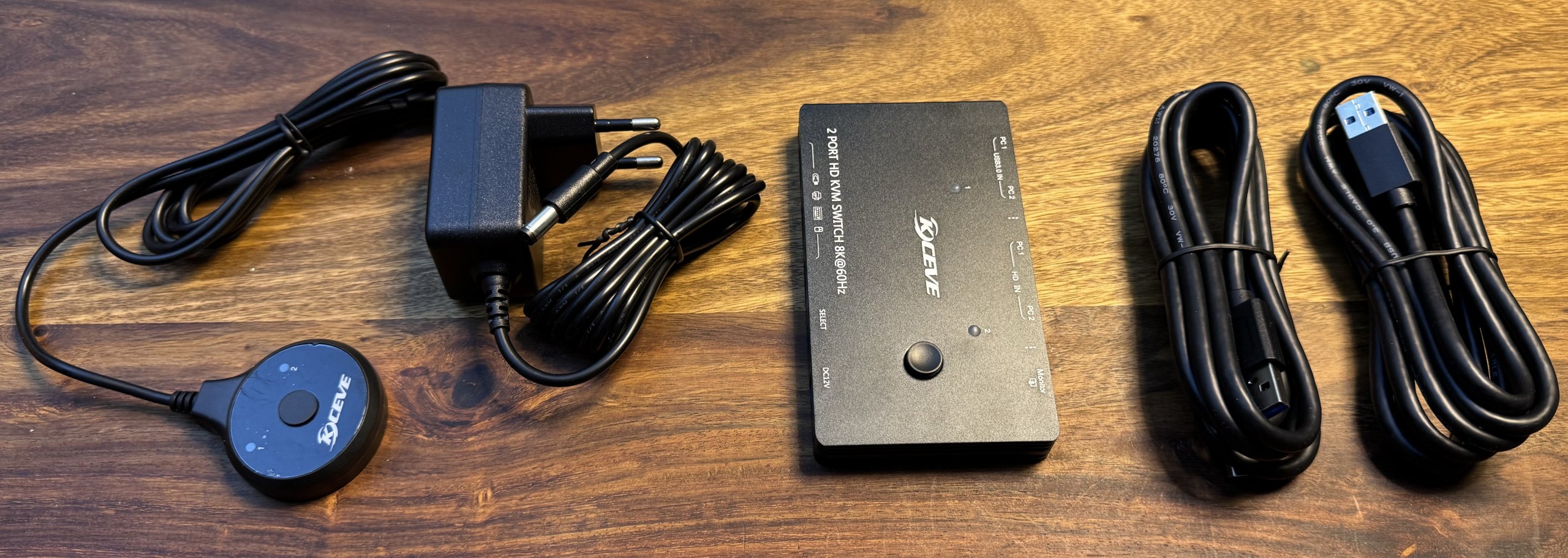 I’ve already written about it: The KC-KVM8201 8K KVM switch is a device that allows you to control multiple computers with just one monitor, keyboard and mouse. Unboxing is a pleasant surprise, as the switch comes securely packaged and with solid equipment. In addition to the switch itself, there are two USB cable sets, a 12V plug-in power supply and a short instruction manual. There is also a remote control button in case you want to hide the switch somewhere. The cables look high-quality and robust, but removing the protective film from the button was hard work.
