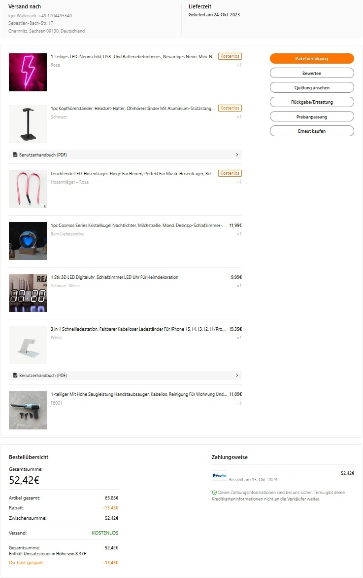 Today, I’m doing a self-experiment: Browsing and shopping at Temu, of course with a set budget and a detailed review of all products in mind, if they all arrive. You guys triggered me recently, and so the time finally came. Ordered on 10/15/2023 and delivered on 10/24/2023, so a delivery time of 9 days. That’s acceptable for now, even though the throw-in mail from Hermes was once again terrible. Tossed into the stairwell, but I had deliberately ordered items that should inherently have a stronger will to survive. And just between us: I’ll never do this again.