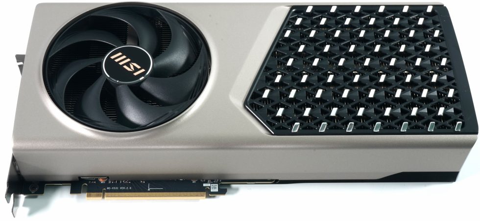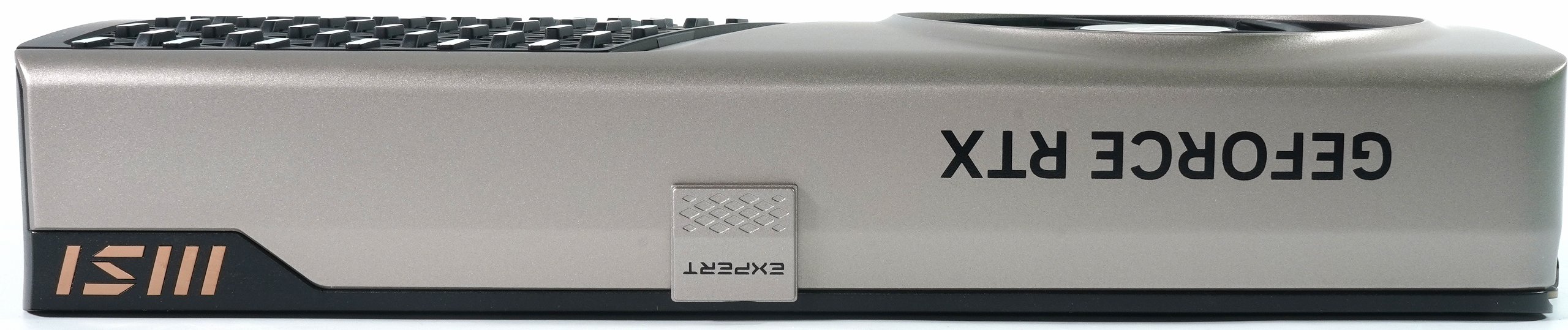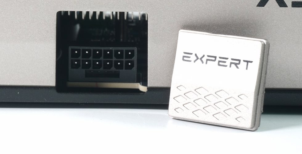 The one-piece, seamless cladding catches the eye on the top, which is interrupted by an embedded “EXPERT” logo. This sits on a small cover plate that can be removed to reveal the new 12V 2×6 connection underneath. The integration of this detail is mechanically clean, without any annoying gaps or wobbly elements. The area around the fan dome is also seamlessly integrated into the housing, giving the card a very compact and closed appearance. Despite the 32 centimeter length, the design appears well thought out instead of bloated.