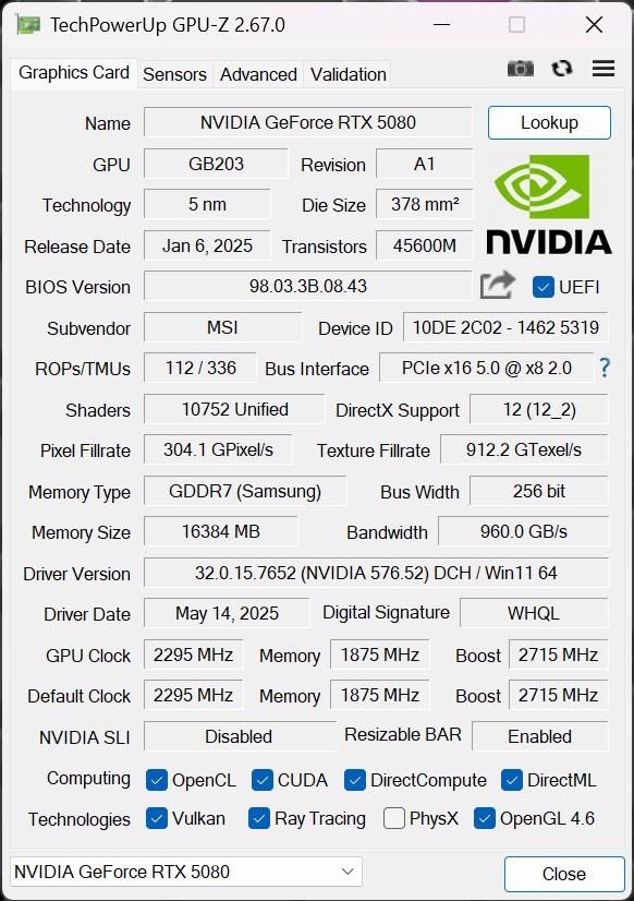 Let’s now turn to the details of this card after its introduction. The card is based on the new Blackwell architecture, the GB203-400-A1 graphics processor is manufactured in a 4 nm production technology and comprises 45.6 billion transistors on a chip area of 378 mm². With 10,752 CUDA cores, a base clock of 2.30 GHz and a boost clock of 2.745 GHz, i.e. 15 MHz more than the RTX 5080 VANGUARD, the card offers high computing power for current applications. It is equipped with 16 GB GDDR7 memory, which operates at 30 Gbps and achieves a memory bandwidth of 960 GB/s via a 256-bit interface. It has 84 fourth-generation ray tracing cores and 336 fifth-generation tensor cores, which significantly improve performance in the area of AI-supported calculations and real-time ray tracing. The L2 cache has been increased to 64 MB to minimize data transfer bottlenecks.