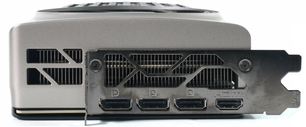 A look at the connection panel reveals the precise design of the air outlets. The trapezoidal openings do not follow a classic honeycomb structure, but are individually adapted to relieve the back pressure zone behind the slatted block as efficiently as possible. The three DisplayPort outputs and the HDMI port are embedded in a precisely milled slot panel. There are no lighting or decorative accents here either, just clear functionality. Specifically, the graphics card has three DisplayPort 2.1b connections and one HDMI 2.1b connection. This configuration enables the simultaneous operation of up to four displays. The DisplayPort 2.1b connections support resolutions of up to 8K at 165 Hz or 4K at 480 Hz, while the HDMI 2.1b connection enables resolutions of up to 8K at 60 Hz or 4K at 120 Hz. These versatile connection options ensure a flexible and powerful connection to different display setups.