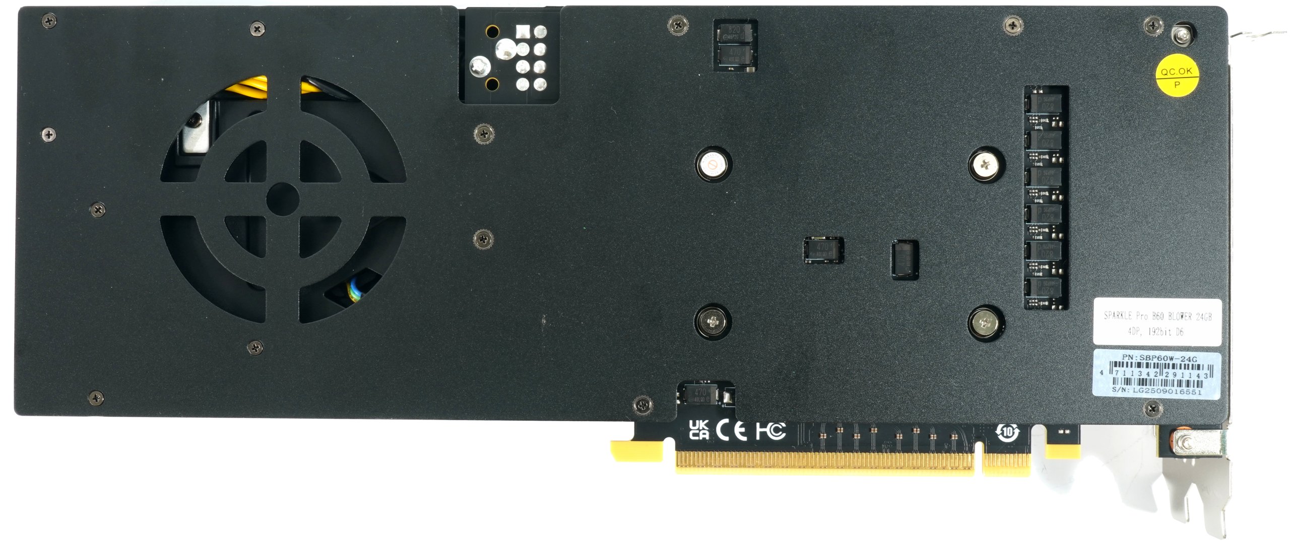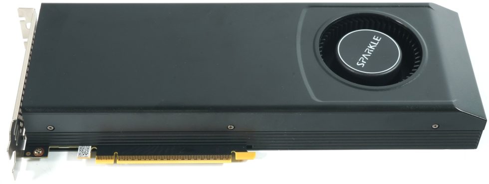 The Blower model shown here is specified by Sparkle with a typical board power consumption of 200 W and uses a single 8-pin PCIe power connector. The 756 gram card measures 29.0 cm in length, 10.5 cm in height and 3.5 cm in thickness plus 0.5 mm for the backplate. The cooler housing has a simple, matt surface, the 6.5 cm radial fan is slightly offset to the right behind a round inlet opening. The front view shows the consistently closed shroud of a blower design, which directs the waste heat out of the housing via the slot bracket.