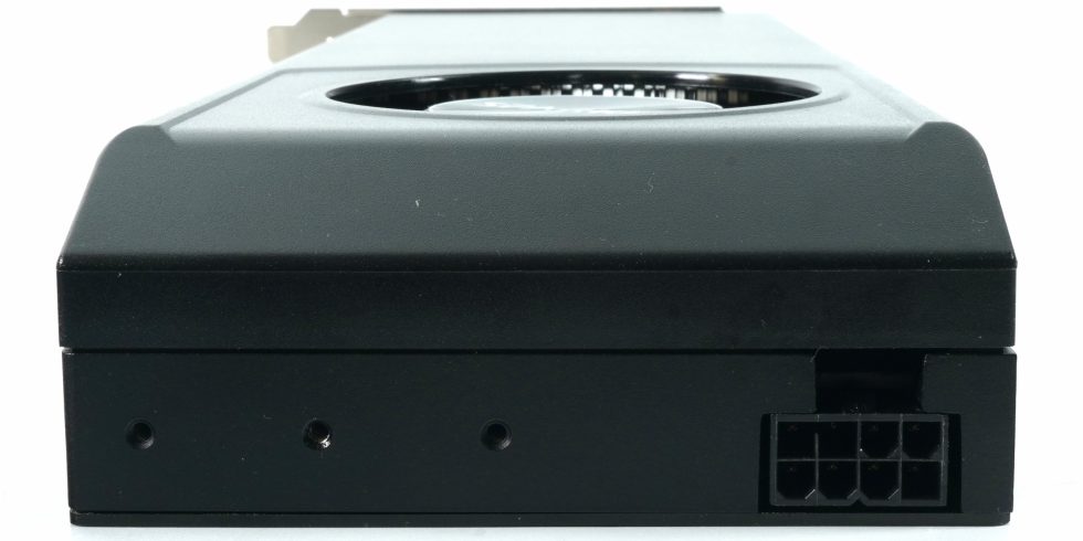 The front at the end of the card shows the 6 2-pin PCIe power connector. The seat is slightly offset inwards, which facilitates cable routing in the housing.