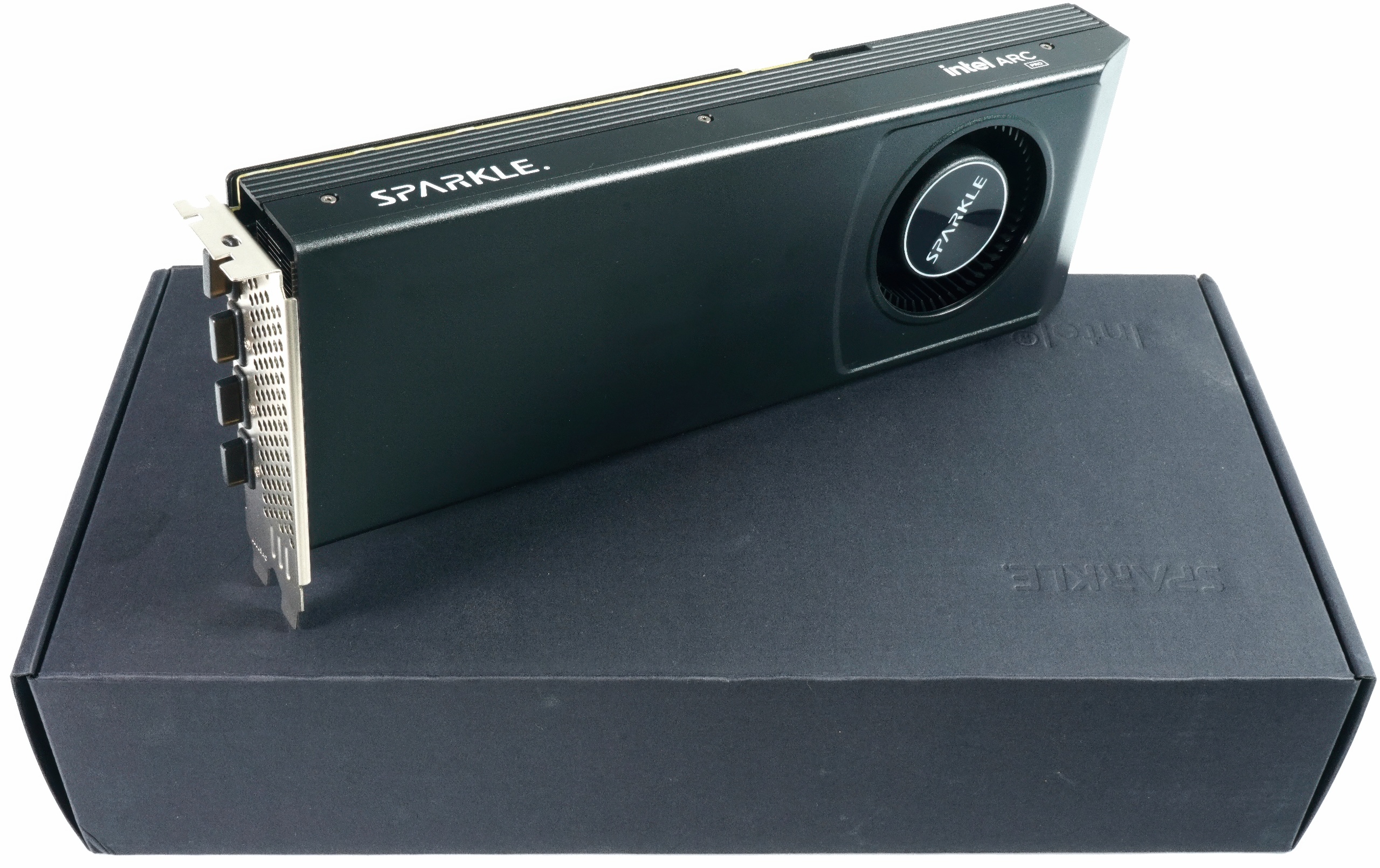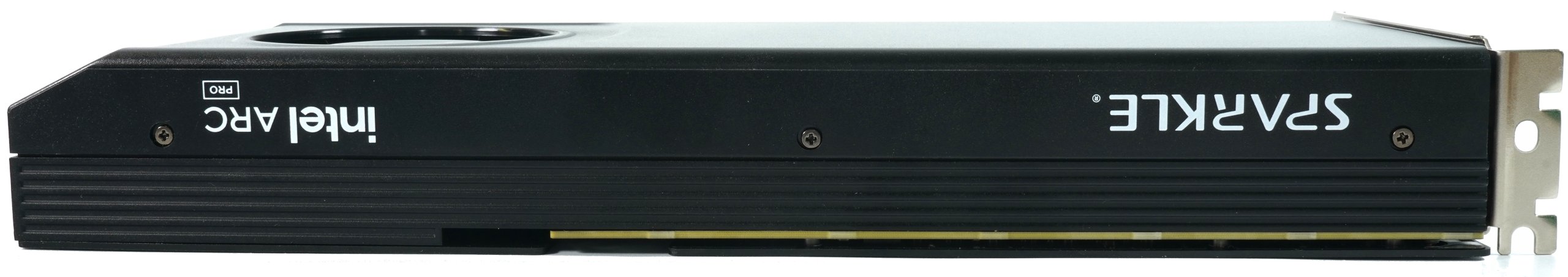 The side profile reveals the typical two-slot height with horizontal slat ends, the shroud bears the inscription “Intel Arc Pro” on the side.