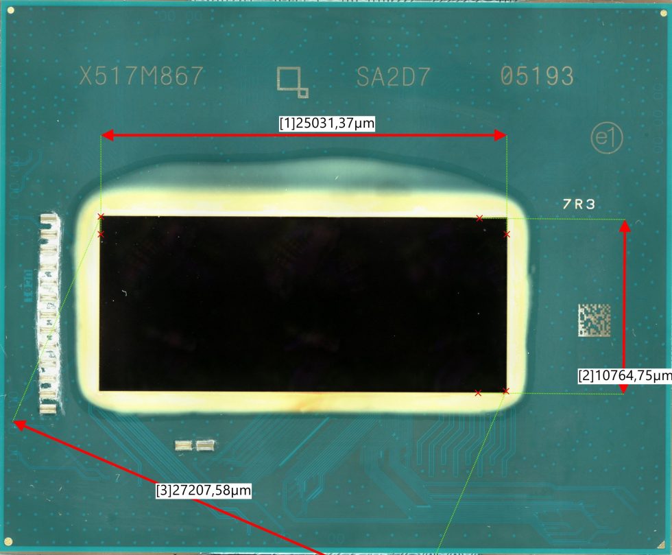 The geometry of the die, measuring around 10.8 × 25.0 mm, corresponds to an area of around 270 mm², which correlates exactly with the GPU-Z specifications and the manufacturer’s data. The measurement not only confirms the plausibility of the specified chip area, but also shows that Intel has opted for a comparatively compact but densely populated design for the BMG-G21. The substrate itself offers generous edges for thermal relief and electrical shielding, which ensures stability, especially for workstation cards with high continuous loads. More on this in the teardown and material test, which will also be interesting.