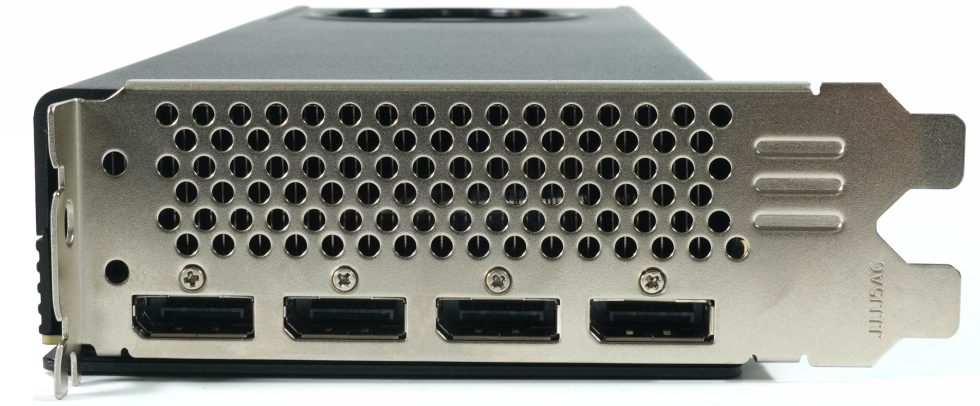 The slot panel is designed as a wide, perforated panel. Four full-format DisplayPort outputs are implemented on this, HDMI is not installed in this version. The configuration thus corresponds to the four-display limit of the GPU and the design of many workstation cards in this class. The upper half serves as an air outlet with round ventilation openings. The combination of a continuous hole pattern and blower radial fan confirms the blow-out principle of cooling, which is often preferred for workstations because the warm air is led directly out of the housing.
