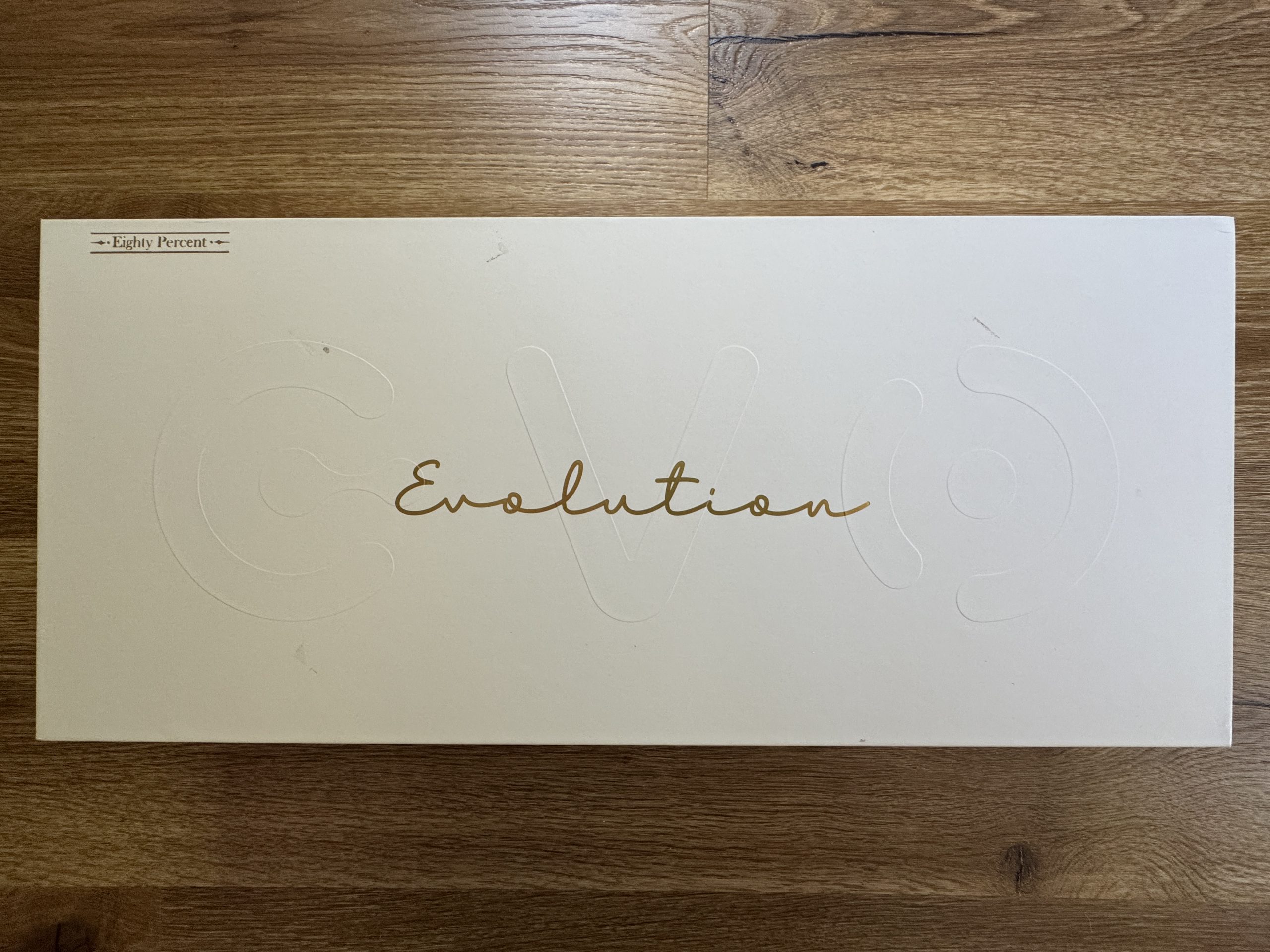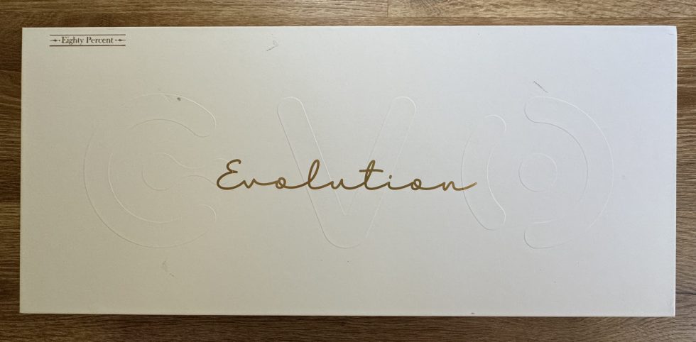 Here you can see the actual product packaging of the Qwertykeys Evo 80. “Evolution” is written in gold on the white box, with the letters “EVO” discreetly embossed in the background. In the top left-hand corner is the inscription “Eighty Percent”, which refers to the 80 percent layout (TKL) of the keyboard.