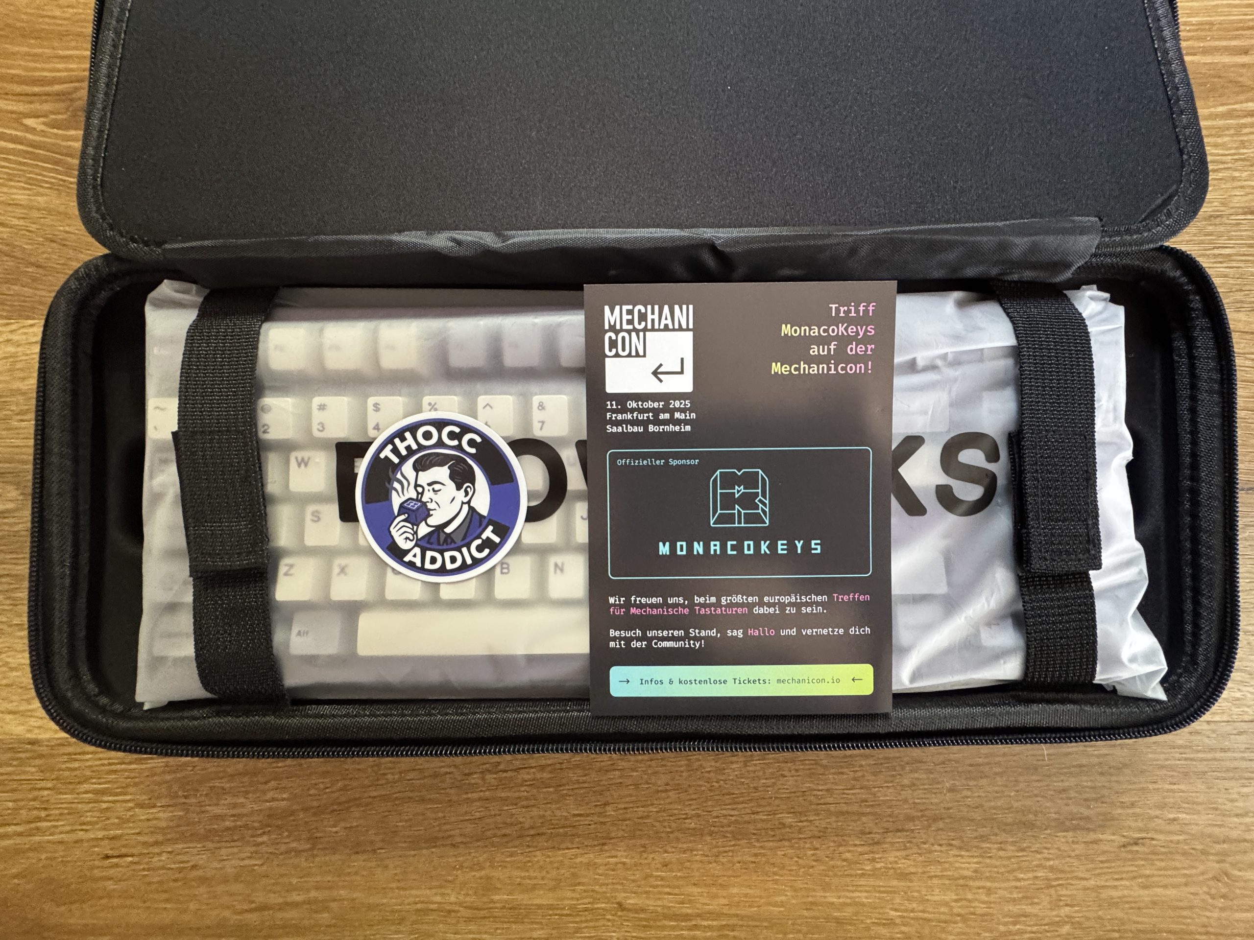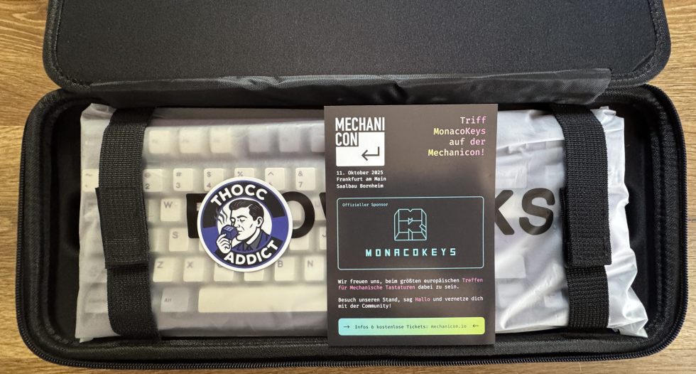 This is a hinged transport or storage case containing the Qwertykeys Evo 80 keyboard. The keyboard itself is still packed in a protective cover and secured with two Velcro straps. There is a round sticker on the keyboard with the inscription “THOCC ADDICT”. Next to it is a flyer for Mechanicon 2025, a trade fair for mechanical keyboards, where Monacokeys is a sponsor. As always, the black case is top quality. Very robust and also very stylish. You should be saying “case” to this one soon.