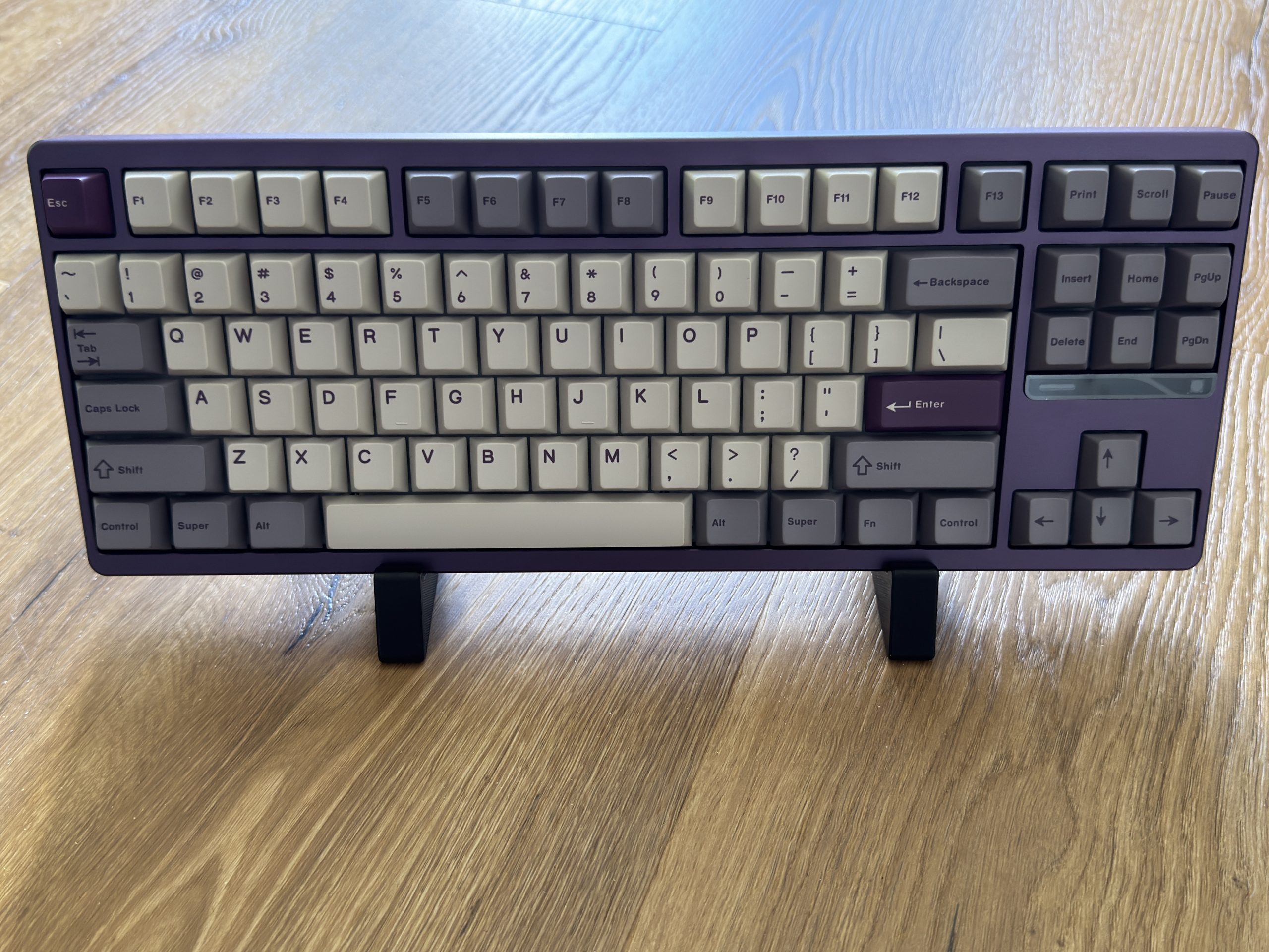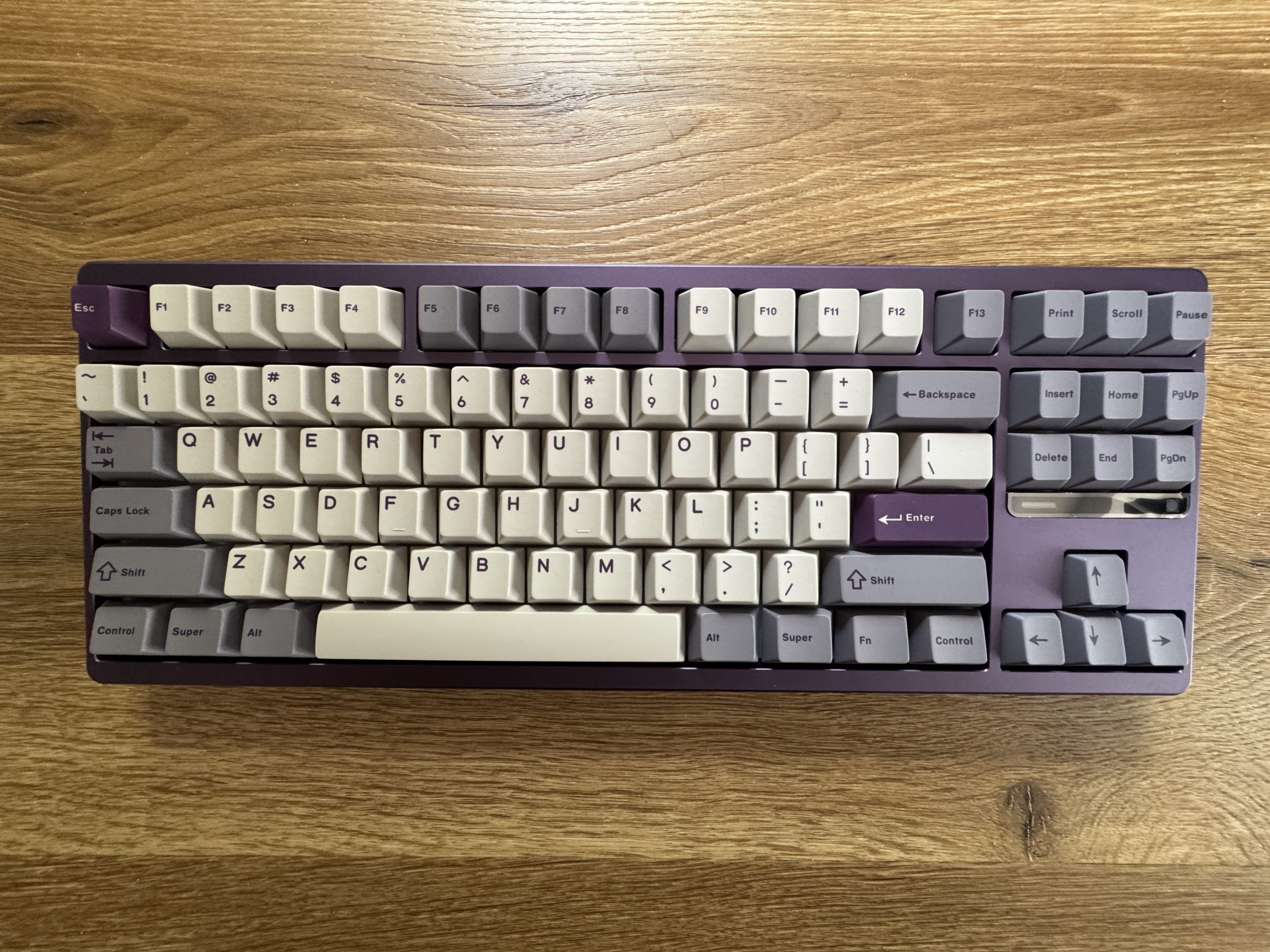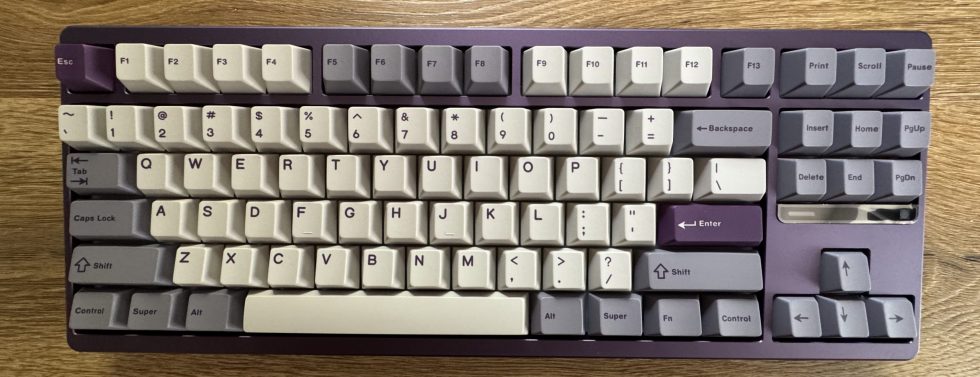 The top of the Qwertykeys Evo 80 in full view. The housing is also in Tyrian and combined with a set of two-tone keycaps in the classic Cherry profile. The keys are designed in a mix of light cream tones and darker shades of gray, creating a restrained but elegant overall impression. Individual keys in Tyrian purple, including the Escape key and the Enter key, provide accents. The layout is a TKL design with a row of function keys and a separate block for navigation keys, but without a numeric keypad. The workmanship is of high quality and the color combination of the housing and keycaps harmonizes well with each other.