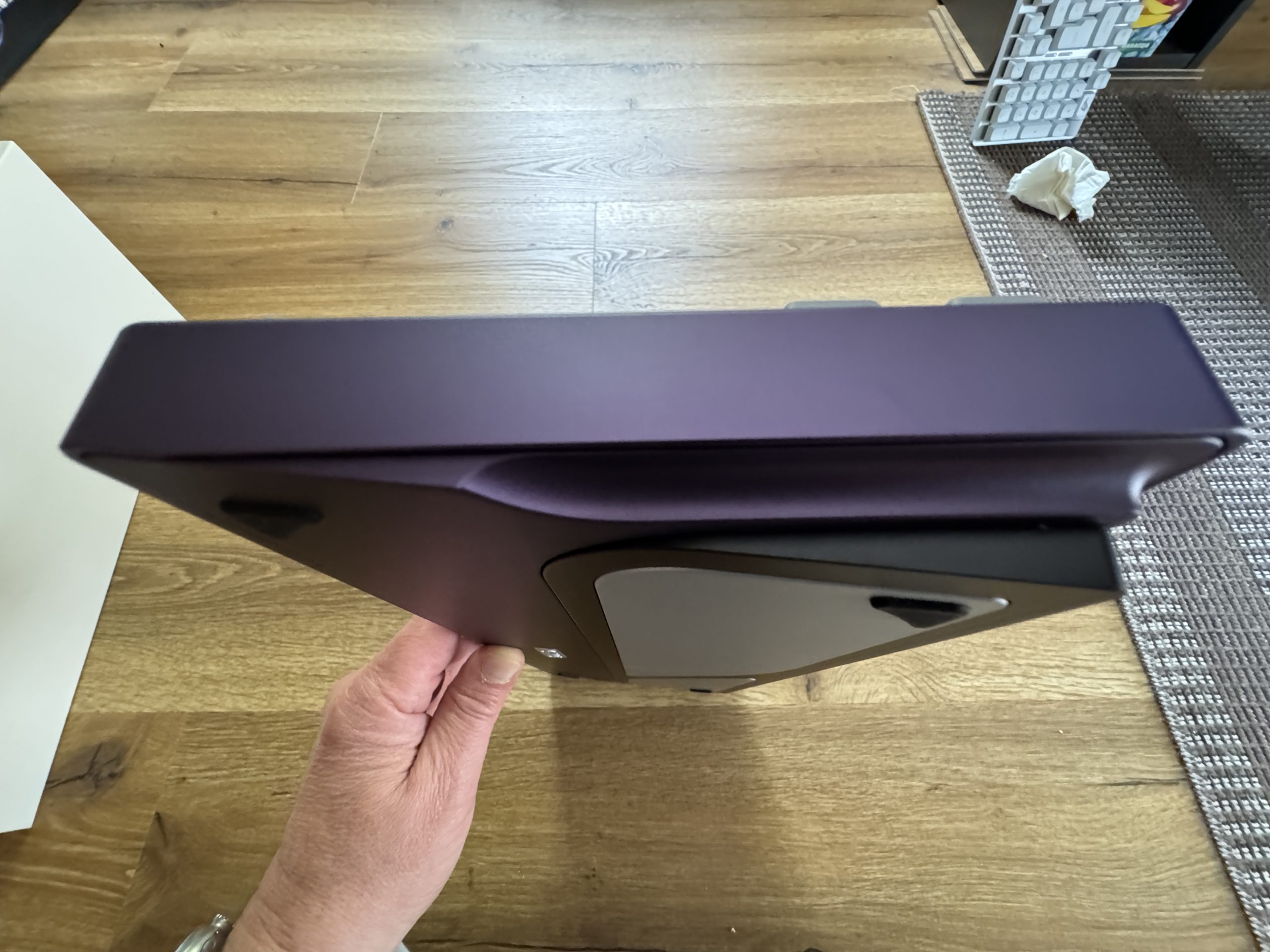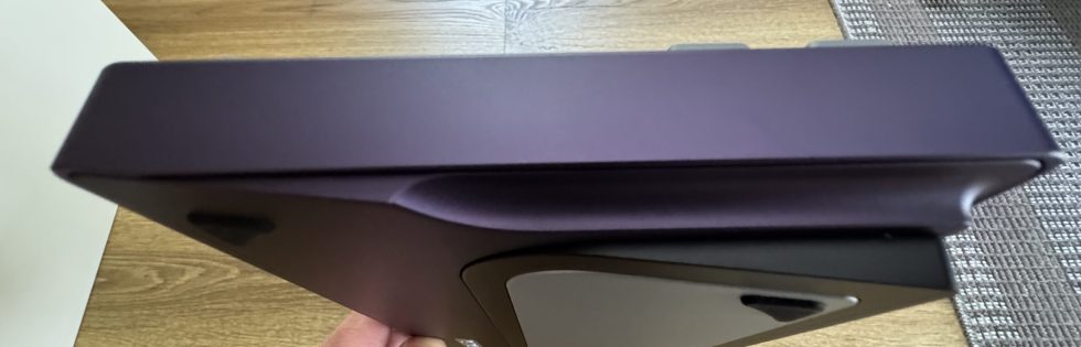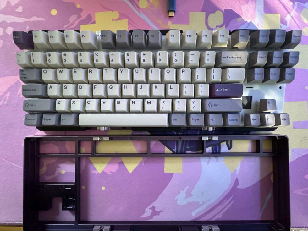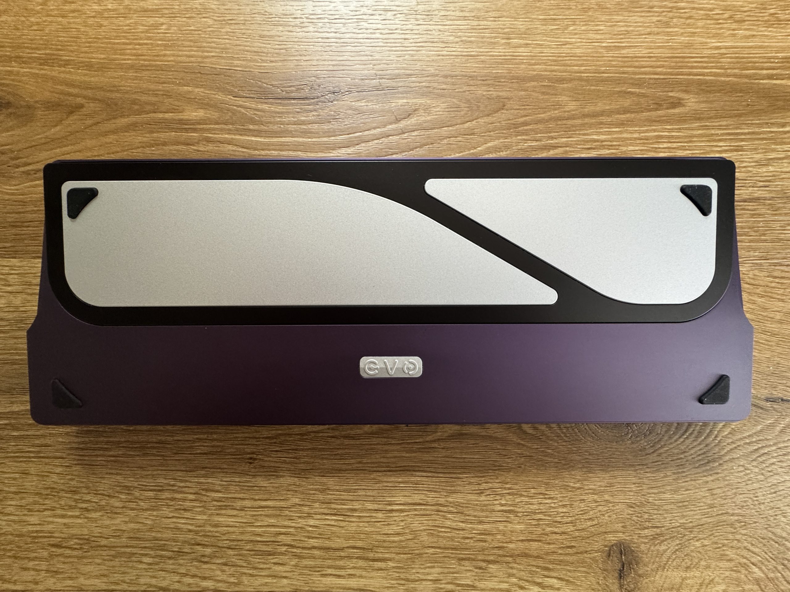 The underside of the keyboard in the “Tyrian” color variant, in a rich purple hue. The back consists of a sturdy aluminum housing with a large silver accent plate divided into two diagonal segments. At the bottom center is a small metal emblem embossed with “EVO”. There are black, triangular rubber feet at the four corners to ensure non-slip stability. The interplay between the dark Tyrian shade and the light metal plate gives the back an elegant yet modern look. I would have liked the EVO plate to be engraved. But it’s all good!