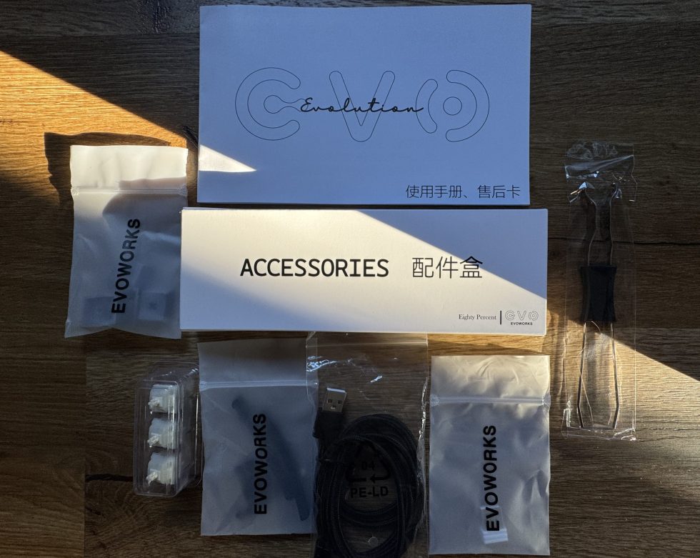 The accessories for the Qwertykeys Evo 80 have been carefully put together and cover all the important points for use and care. Included are three spare switches in a small transparent box, several small bags labeled “EVOWORKS”, which contain additional small parts such as screws or damping elements, as well as a braided USB-C cable for wired operation. There is also a white box labeled “ACCESSORIES”, which contains some of the accessories. And a printed manual including a warranty card with a simple Evo design. The package is rounded off with a black keycap puller, which can be used to safely remove keycaps. Everything you need for spare parts, connectivity, adjustments and the first steps on the new board is therefore included.