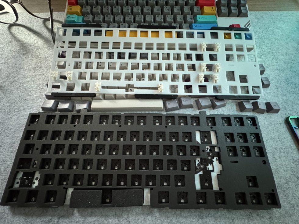 The plate is also very soft and flexible. Nevertheless, this is a stable material made of polypropylene. This is a thermoplastic material that is characterized by high toughness and elasticity. This material is used in keyboard construction because it is much softer than aluminum, brass or FR4. This results in a much softer, springy typing feel. The sound is generally deeper, more muted and less metallic than with hard plates. So it is suitable for the chosen sound profile. Nevertheless, the board is also available with a Fr4 plate.