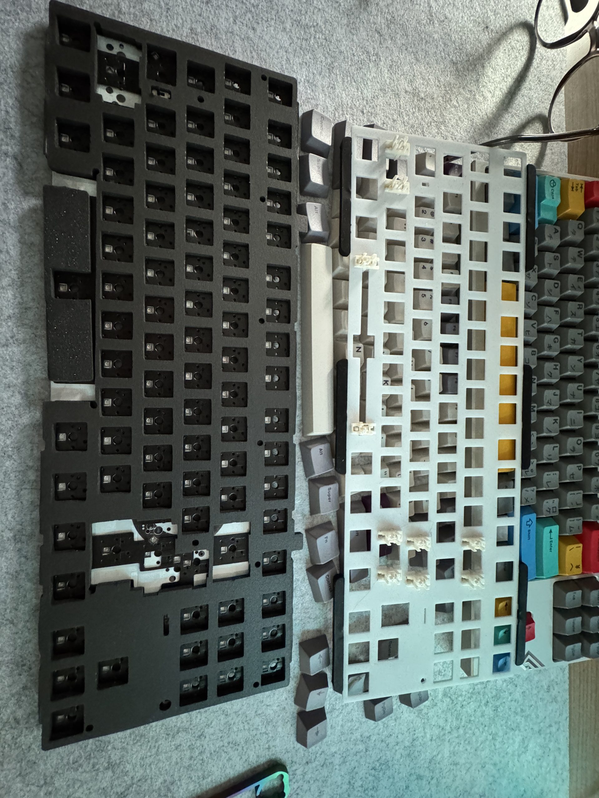 The PP plate is mounted on a 1.2 mm thick Flex-Cut PCB, which gives the entire structure a very high degree of flexibility. This makes the overall typing feel much more agile. The plate-mount stabilizers that are used here are also clearly visible in this context. Surprisingly, they do their job quite well and stand out positively in practical use. If you put the two foams in at the bottom, it becomes a little firmer. Also very pleasant!