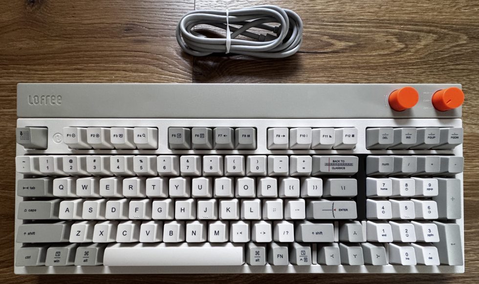 The top shows the complete layout with 98 keys in various shades of gray, creating a calm, clear overall impression. The main keys are kept light, while certain functional areas are accentuated slightly darker. The two orange rotary knobs on the top right edge are striking, deliberately breaking up the minimalist color scheme and offering a retro-style user interface. The Lofree logo is embedded in the top left, and a neatly rolled-up USB-C cable is located above the keyboard. The overall impression is structured, tidy and visually reminiscent of classic input devices from past decades.