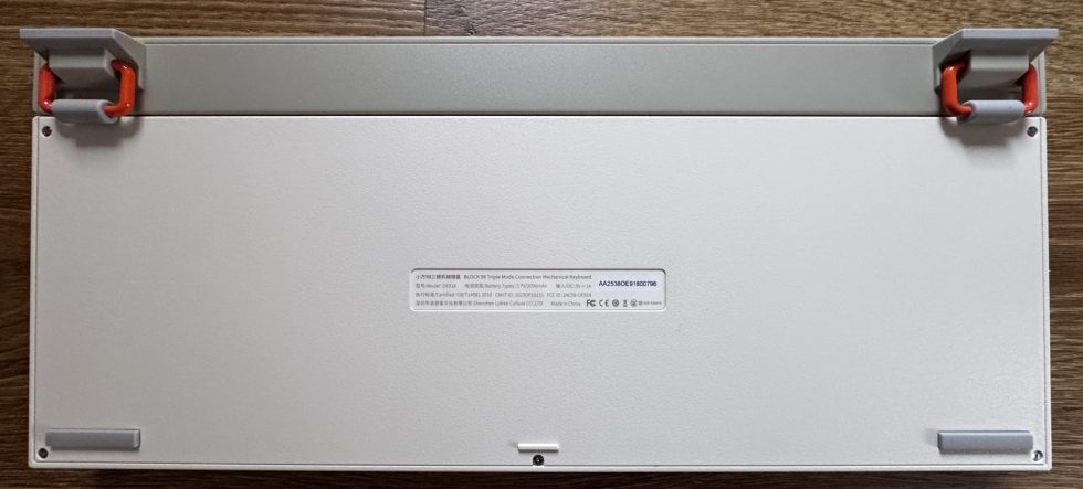 The underside of the keyboard has a bright, matt plastic casing with a slightly textured surface. Two fold-out feet on the top edge create a clear accent, as they are in gray and attached with striking orange joints. This construction provides stability and gives the design a functional, slightly industrial character. There is a narrow sticker in the middle with the model name, certifications and manufacturer information. There are flat rubber pads at the four corners, which are designed for a secure stand and non-slip use on the table.