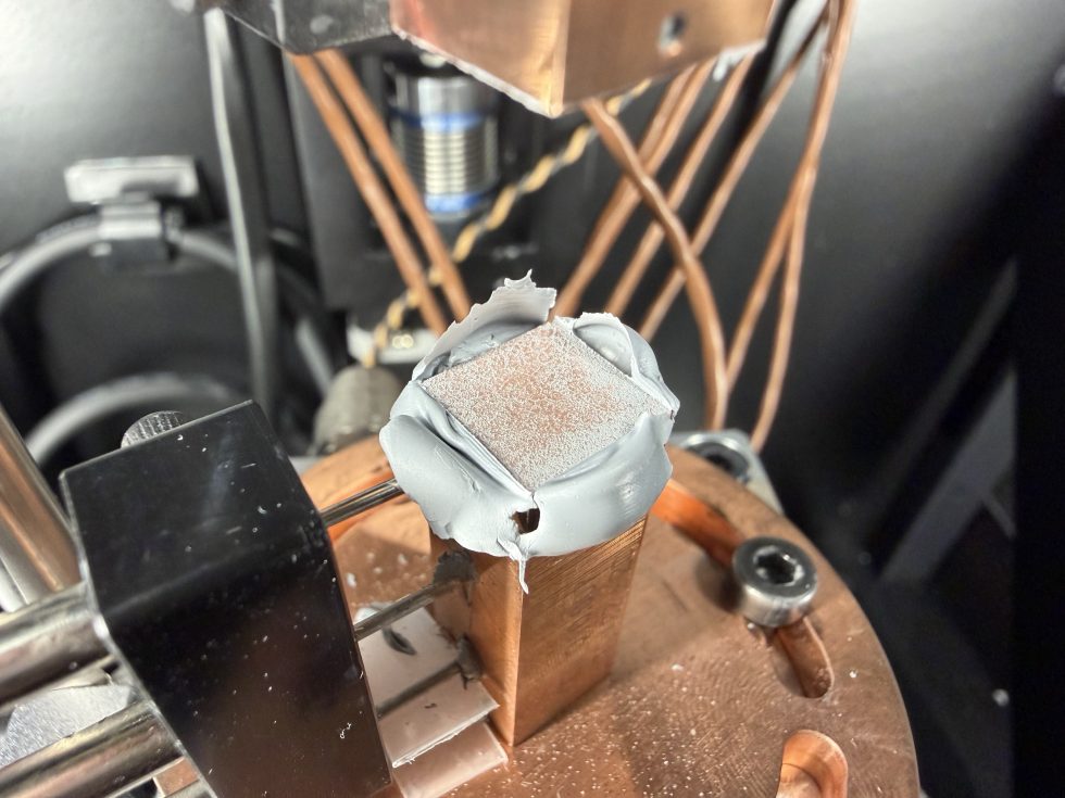 Parallel to this planned expansion of the thermal paste database, I have also extensively upgraded the TIMA5 measuring system together with the manufacturer Nanotest in order to achieve even more precise and reproducible measurement data in future. The previous setup reached its physical limits, particularly with high thermal loads and very conductive materials, as the temperature differences across the sample were sometimes too small due to thermal drifts in the micrometer range to be recorded accurately without additional measurement uncertainties. The heart of the upgrade is now a new heating block (heater) with exactly twice the performance of the previous version. This allows the heat flow to be driven in finely graduated stages into ranges that realistically reproduce even extreme GPU scenarios. In this way, the TIMA5 can now measure both low-conductive and highly conductive materials under exactly the same conditions without the measurement curve getting lost in noise or the temperature gradients becoming too small.
