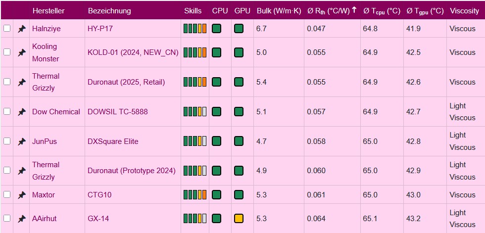The new database interface therefore primarily uses the measured Rth and the temperatures derived from it for a Ryzen 7 9700X with 125 watts and an RTX 4090 with 450 watts, which are explained in detail in the article. The bars of classic comparison tests suggest an accuracy that is physically untenable. Even minimal deviations in layer thickness, contact quality, contact pressure, micro-roughness or the internal variance of the heatspreader change the result more than the material difference of the pastes. The seemingly fine resolution of the diagrams is therefore misleading, as the measurement cannot show the decimal places shown. In reality, the differences shown are within the usual scatter of a single order. The ranking list therefore reflects random influences rather than the actual performance of the pastes. This is not the fault of the tester, but shows that such comparisons are hardly useful as a technical reference.