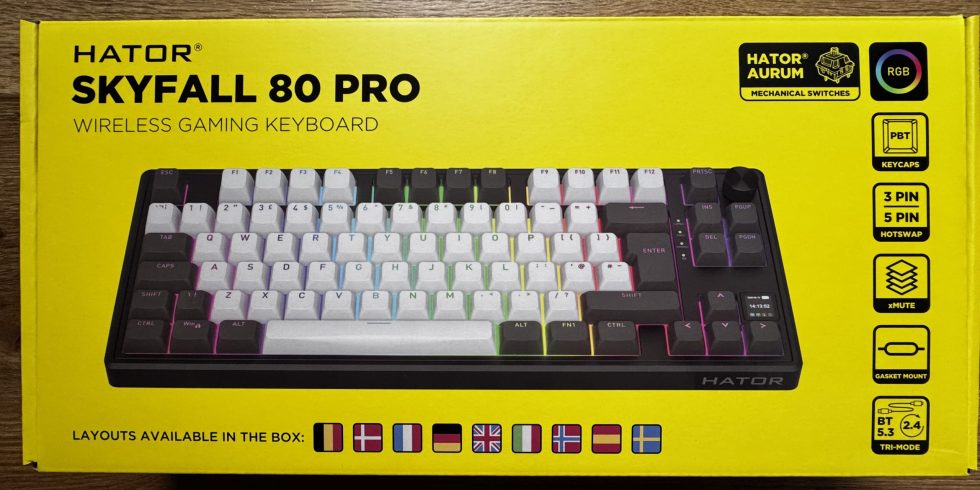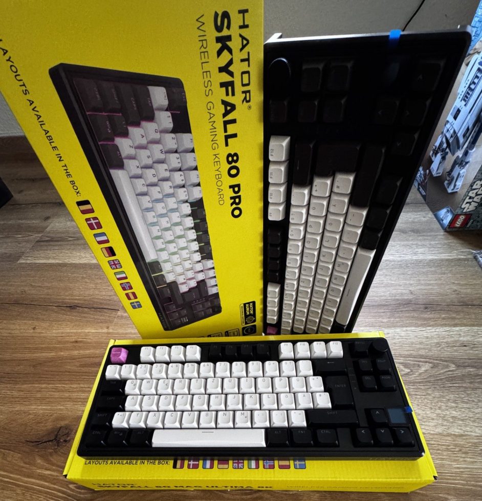 The Skyfall 80 Pro looks almost identical, but uses conventional mechanical Hator Aurum switches and offers hot-swap support for 3- and 5-pin switches. Features such as PBT keycaps, quiet damping, gasket-mount construction and tri-mode connectivity are also listed here.