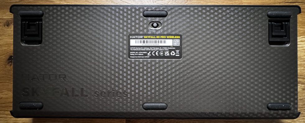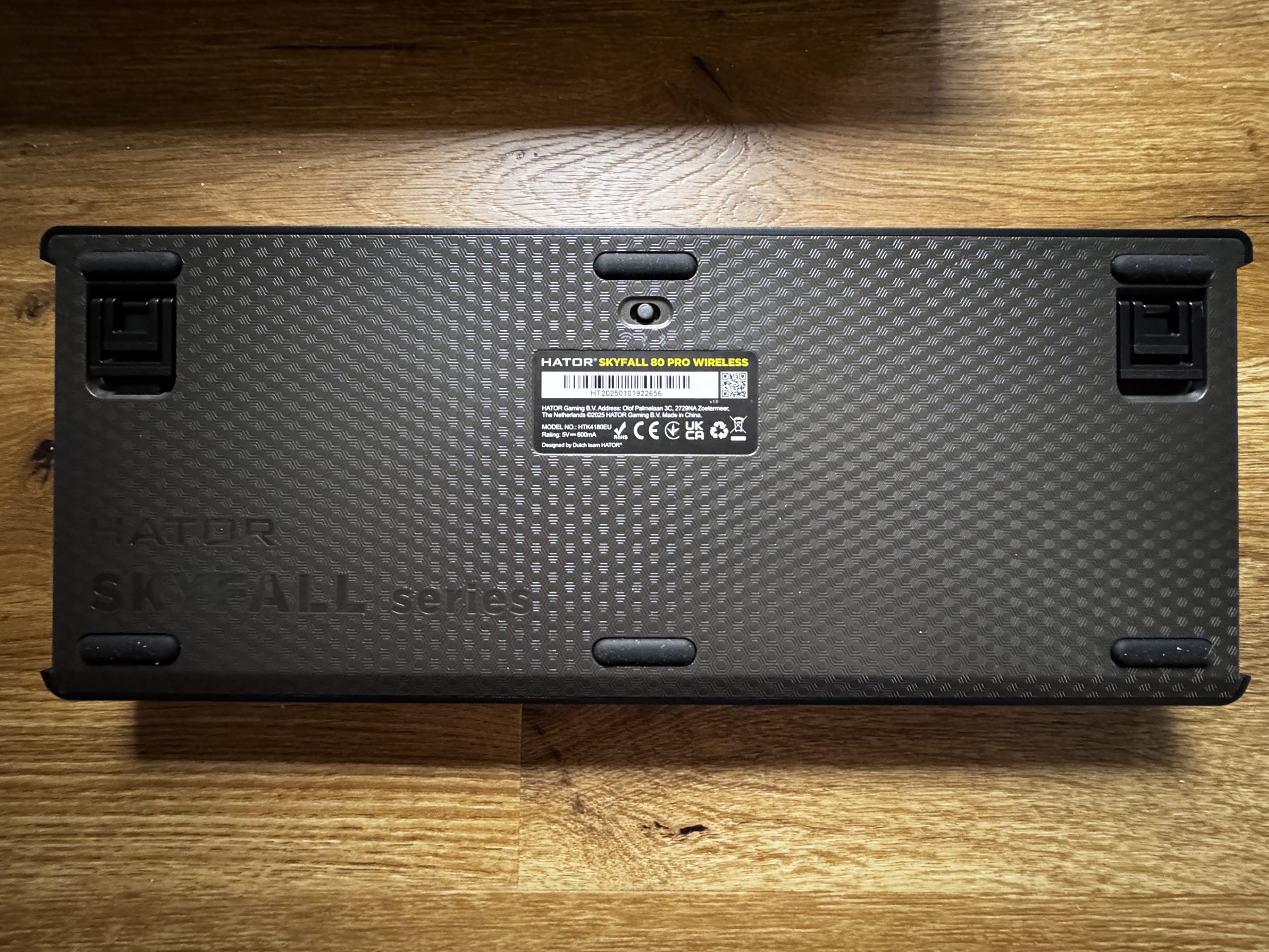 The Hator Skyfall 80 Pro features a dark, finely textured housing on the underside with the embossed Hator lettering and four rubberized support points for a secure hold. Two fold-out stands allow for an adjustable tilt, and the nameplate with model designation is positioned centrally. Everything looks sturdy, neatly finished and well thought out.