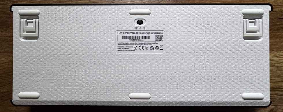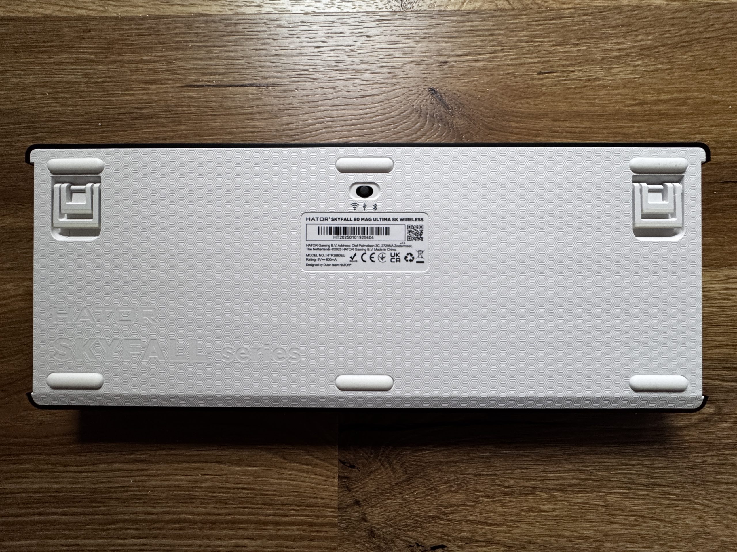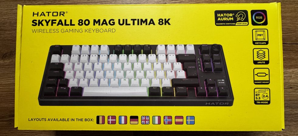The Skyfall 80 MAG Ultima 8K is equipped with magnetic Hator Aurum switches and supports a sampling rate of up to 8000 Hz. The most important features are shown on the right-hand side of the packaging: PBT keycaps, gasket-mount construction, Bluetooth 5.3, 2.4 GHz and USB-C connectivity, and RGB lighting.