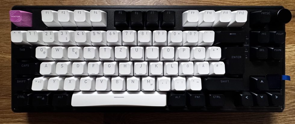 On the top, the compact 80 percent layout presents itself in a high-contrast black and white design. The rotary control at the top right is used for volume and media control, while the evenly arranged buttons leave a tidy and high-quality overall impression. The board has a robust, modern look and is clearly designed for functionality and convenience.