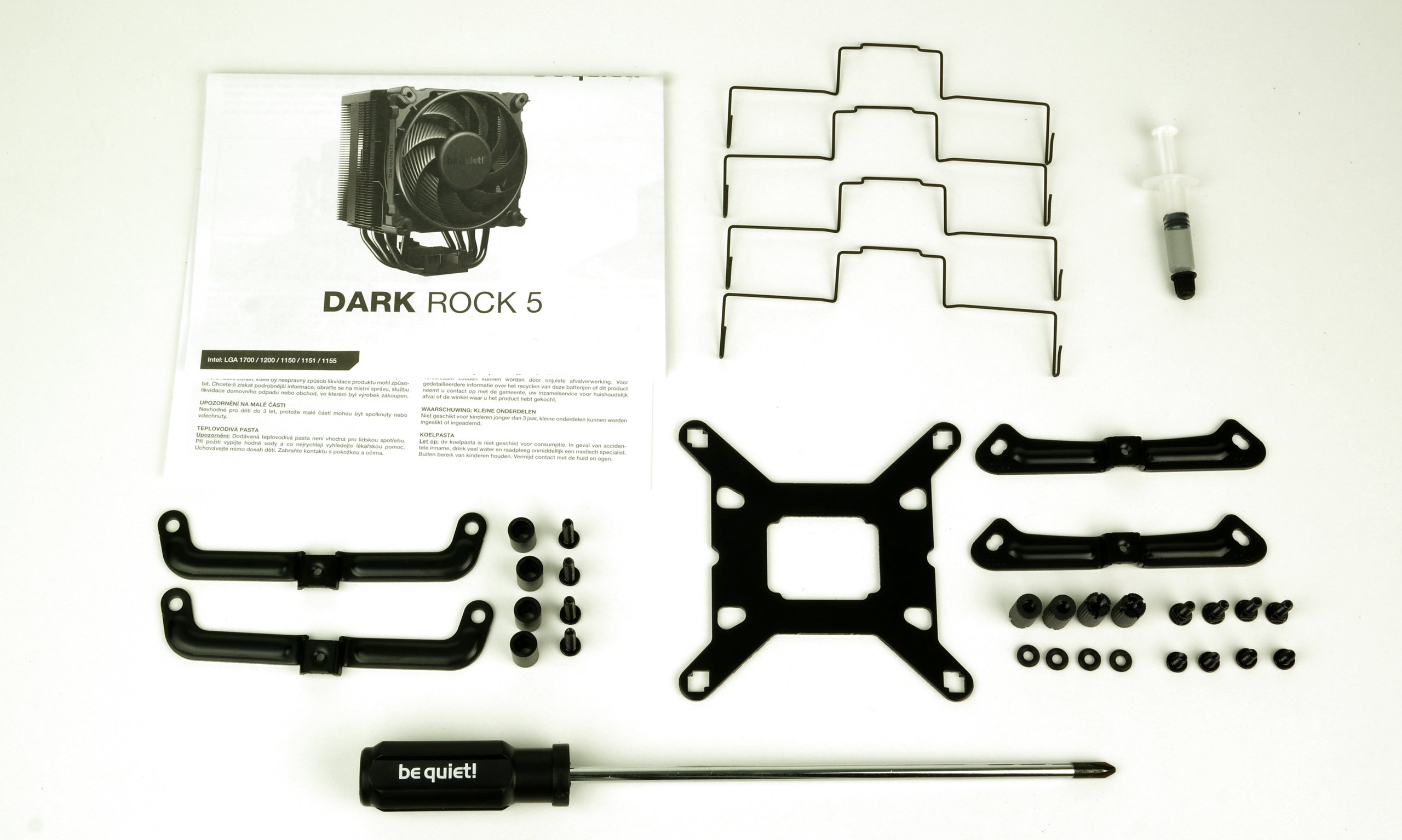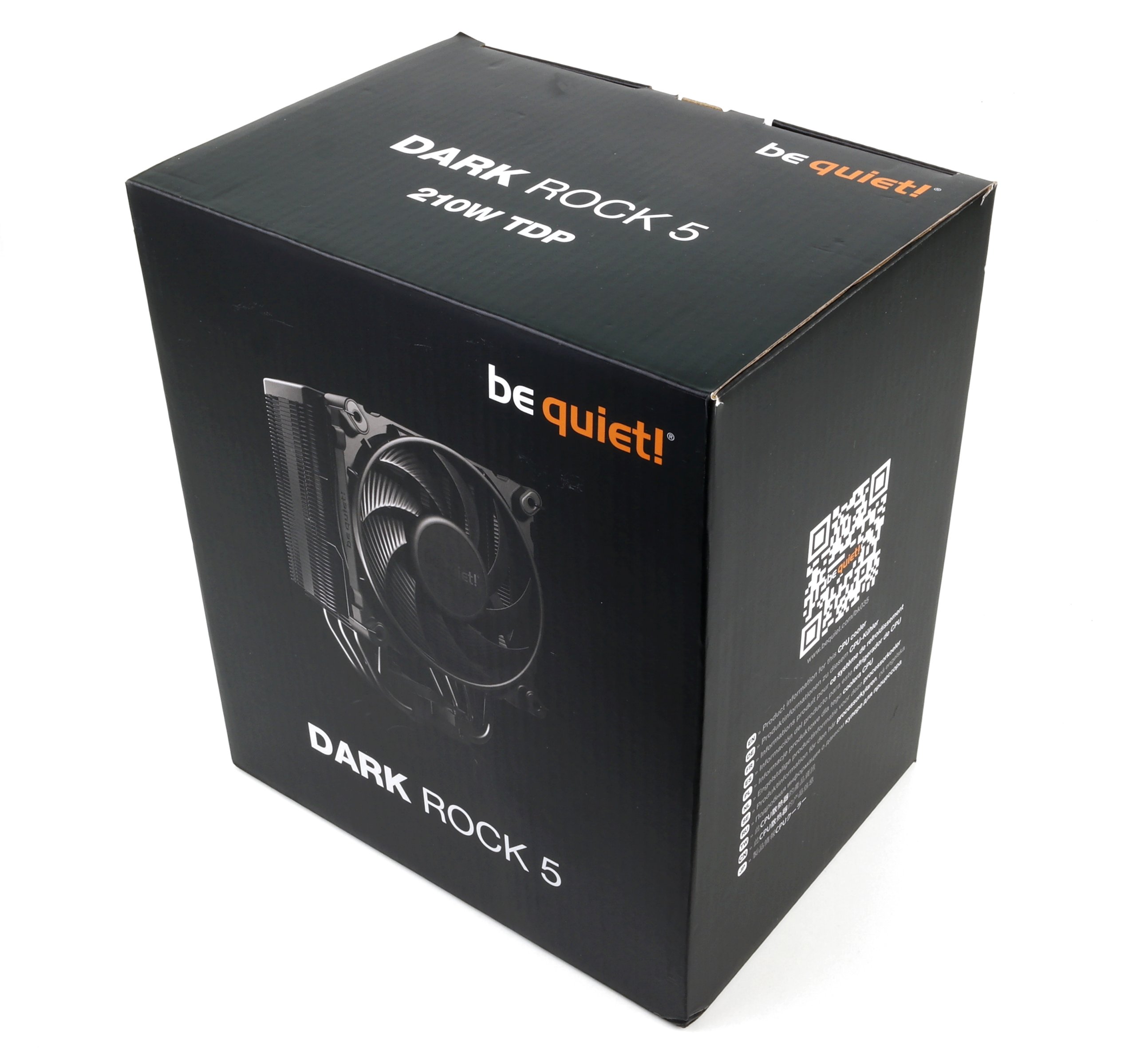 The box of the Be Quiet! Dark Rock 5 has a classic, discreet design in black with high-quality printed elements. The cooler itself, the fan and central features such as “Silent Wings 4” and the high cooling capacity are prominently displayed on the front. The rear and side panels provide detailed information on technical data, compatibility with CPU sockets and special features such as the magnetic top cover or the ceramic particle coating.