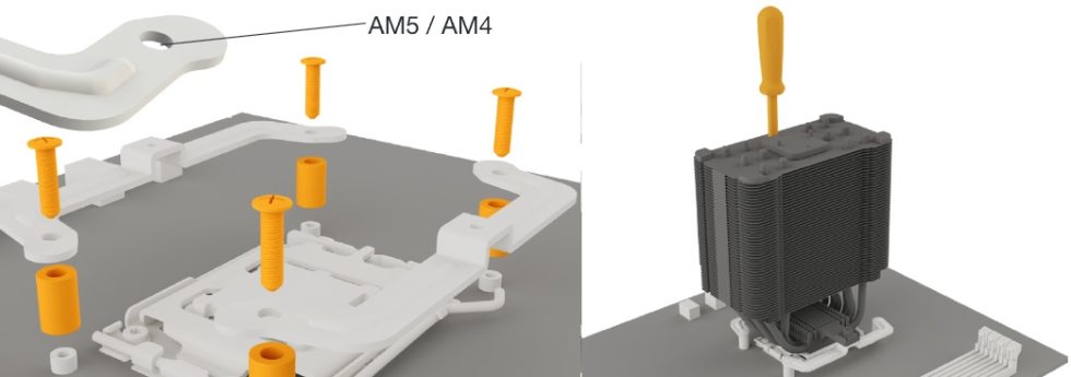 The standard AMD backplate is used for mounting on the AM5 socket you are using. First remove the two factory plastic brackets from the mainboard. Then the supplied spacers are placed on the threaded bolts of the backplate before the metal mounting frame of the Dark Rock 5 is placed and fixed in position. The cooler itself is then positioned and tightened evenly to ensure a clean and constant contact pressure. Finally, the magnetic top cover and the fan are mounted so that the Dark Rock 5 is ready to cool the CPU efficiently.