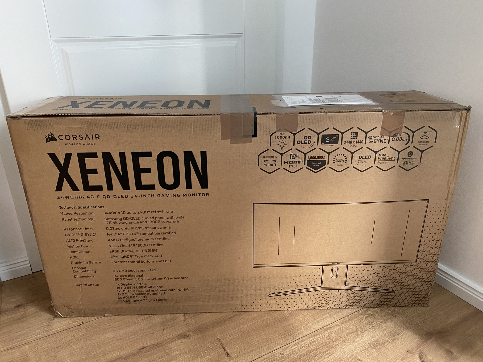Corsair sent me the new 34-inch ultrawide monitor, of course with the request that I take a look at it. The Corsair Xeneon 34WQHD240-C QD-OLED, everything you need to know is in the name. Screen diagonal 34″, resolution WQHD 3440 x 1440p, refresh rate 240 Hz and the C = Curved. However, when I saw the price of 1,350 euros, all the batteries flew out of my pacemaker! So today we’re going to embark on an interesting quest to find out to what extent the extra price of around €660 compared to my Samsung Odyssey OLED G8 (34 inch) might be justified.