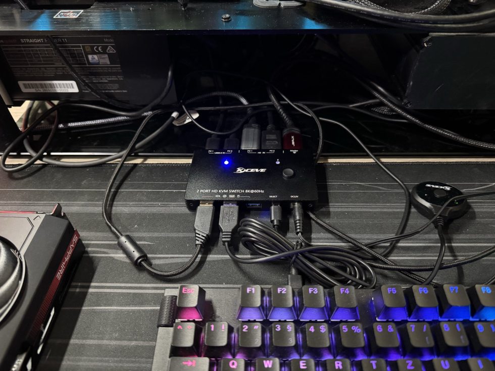 I’ve already written about it: The KC-KVM8201 8K KVM switch is a device that allows you to control multiple computers with just one monitor, keyboard and mouse. Unboxing is a pleasant surprise, as the switch comes securely packaged and with solid equipment. In addition to the switch itself, there are two USB cable sets, a 12V plug-in power supply and a short instruction manual. There is also a remote control button in case you want to hide the switch somewhere. The cables look high-quality and robust, but removing the protective film from the button was hard work.