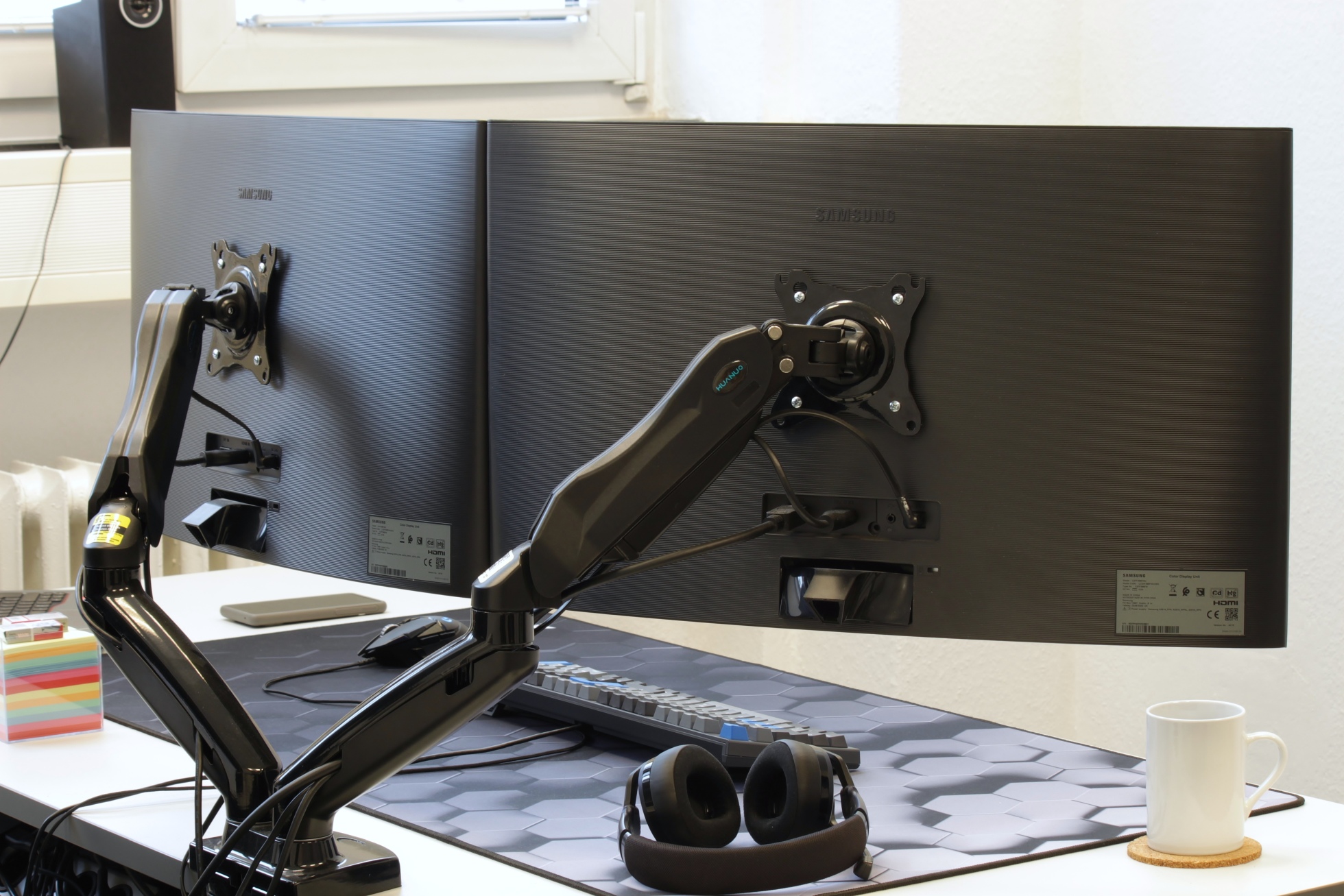 The worst thing is when your colleagues want to show you something and smear their fingers on the monitor, or destroy the alignment directly when waving their hands. You can screw the mounts on as tightly as you like, but almost every day you get to see this sight: