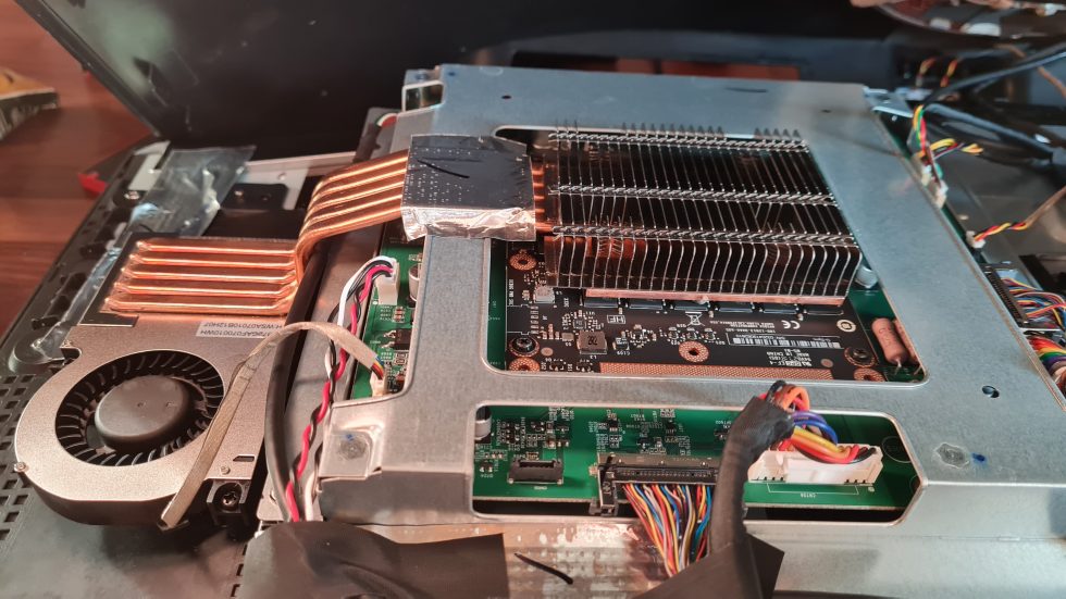 So I disassembled the monitor again and took a look at what was underneath the cooling copper construction. The result is on the one hand very viscous thermal paste between the base plate and the actively cooled chip, and underneath a black board, which resembles with layout and components at first sight a graphics card in MXM format, as it is also known from notebooks.