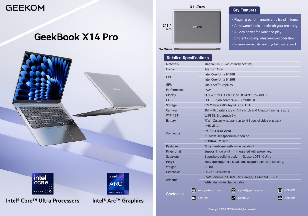 The GEEKOM GeekBook X14 Pro is a compact notebook in a 14-inch format that, according to the product presentation, is based on Intel Core Ultra processors with integrated Intel Arc graphics. The device combines a slim chassis with an OLED display, modern connectivity and AI-supported functions that are geared towards productive and mobile usage scenarios.