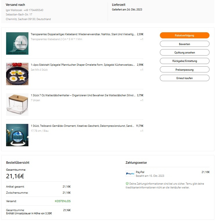 Today, I’m doing a self-experiment: Browsing and shopping at Temu, of course with a set budget and a detailed review of all products in mind, if they all arrive. You guys triggered me recently, and so the time finally came. Ordered on 10/15/2023 and delivered on 10/24/2023, so a delivery time of 9 days. That’s acceptable for now, even though the throw-in mail from Hermes was once again terrible. Tossed into the stairwell, but I had deliberately ordered items that should inherently have a stronger will to survive. And just between us: I’ll never do this again.