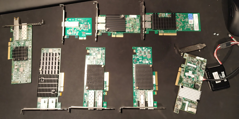 In the picture, we see the customer’s test field (from left to right) and what worked or mostly didn’t: Broadcom P225P (firmware up to date!), next to it the top row with the OEM i210, OEM x550 T2L, and Intel X710 T2L (no OEM, original from Intel) and the bottom row with Emulex OCE14102 (10GbE RJ45) (firmware up to date), Emulex OCE14xxx (10GbE SFP ), Emulex OCE11xxx (10GbE SFP ) (firmware up to date, very old, but with UEFI support and HII) as well as an LSI Megaraid (ACAGO/ Broadcom 9271 4i with supercapacitor).