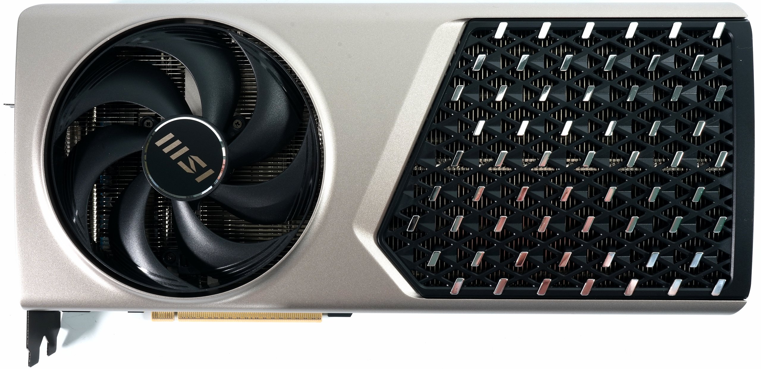 The front of the RTX 5080 Expert is dominated by an asymmetrically divided radiator cover. On the left is a large axial fan with a rotor blade diameter of 11.5 centimetres, which is housed in an opening with a free cross-section of around 12 centimetres. This generates a high static pressure, which is particularly beneficial with a dense blade structure. To the right of this is a structured, grid-like outlet zone with embedded metal applications in a diamond shape. This segment is not only used for ventilation, but also blends harmoniously into the overall geometric design. The slightly shimmering metallic surface has a high-quality appearance and remains pleasantly unobtrusive. RGB is not used here, which further enhances the clear design language.