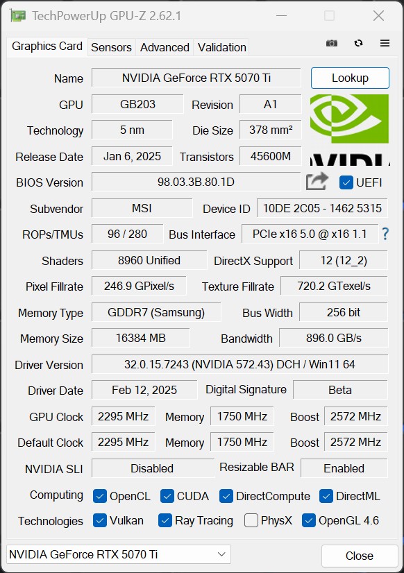 The GB203-300-A1 chip is manufactured by TSMC using the 5 nm process and comprises around 45.6 billion transistors on a die area of 378 mm². The RTX 5070 Ti is designed for gaming and creative applications and offers support for technologies such as DLSS 4 with Multi Frame Generation, NVIDIA Reflex 2 with Frame Warp and hardware-accelerated ray tracing. It is capable of delivering high frame rates at resolutions up to 4K, making it suitable for the latest AAA games and professional applications.