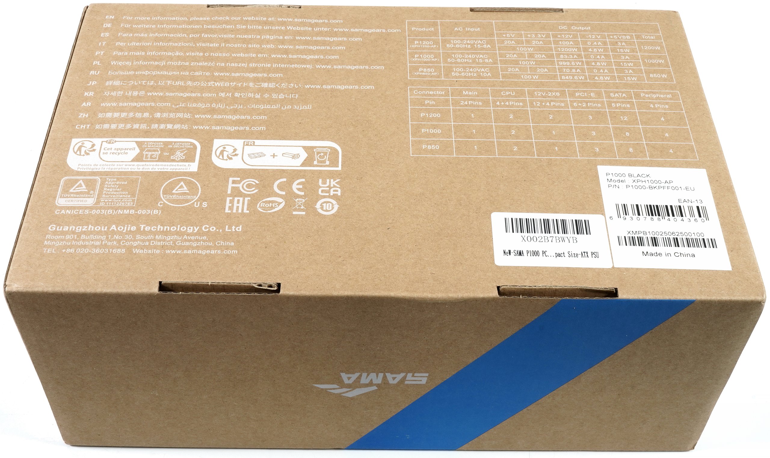In order to fully understand the positioning of the power supply unit, it is important to understand who SAMA actually is. The SAMA brand belongs to a Chinese manufacturer that has been present on the Asian market for many years, where it mainly offers cases and peripherals in addition to power supplies. SAMA is less well known in the Western market, but has become increasingly popular since the demand for cost-efficient ATX 3.1 models has increased. In contrast to the major international brands, SAMA does not have a globally established brand history and acts more as a manufacturer that combines price appeal with a solid technical basis. The platforms usually come from OEM partners such as RSY, a manufacturer that has been used more frequently in the mid-range performance segment and whose products are technically reliable but not necessarily premium-oriented. This background explains why the P1000 can be offered at a significantly lower price than models with a higher brand claim, despite good technical features such as fully modular cabling, ATX 3.1 conformity and contemporary EMI and protection circuitry.