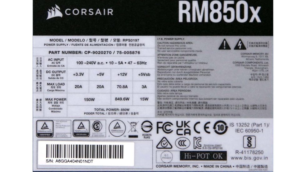 The technical specifications of the Corsair RM850x Shift are based entirely on the Cybenetics certificate and show a modern, cleanly designed platform that has been designed for high efficiency, good thermal stability and robust power delivery. The shifted position of the modular connection panel only changes the mechanics, not the electrical structure of the device. The platform comes from the OEM Channel Well Technology, which has been a reliable developer and manufacturer of high-quality power supply platforms for many years. The following technical specifications summarize both Cybenetics tables in a consolidated overview, so that all relevant electrical, mechanical and design parameters are presented in a uniform manner.