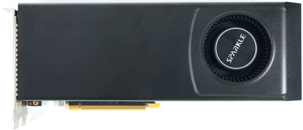 The Blower model shown here is specified by Sparkle with a typical board power consumption of 200 W and uses a single 8-pin PCIe power connector. The 756 gram card measures 29.0 cm in length, 10.5 cm in height and 3.5 cm in thickness plus 0.5 mm for the backplate. The cooler housing has a simple, matt surface, the 6.5 cm radial fan is slightly offset to the right behind a round inlet opening. The front view shows the consistently closed shroud of a blower design, which directs the waste heat out of the housing via the slot bracket.