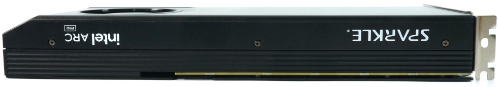The side profile reveals the typical two-slot height with horizontal slat ends, the shroud bears the inscription “Intel Arc Pro” on the side.