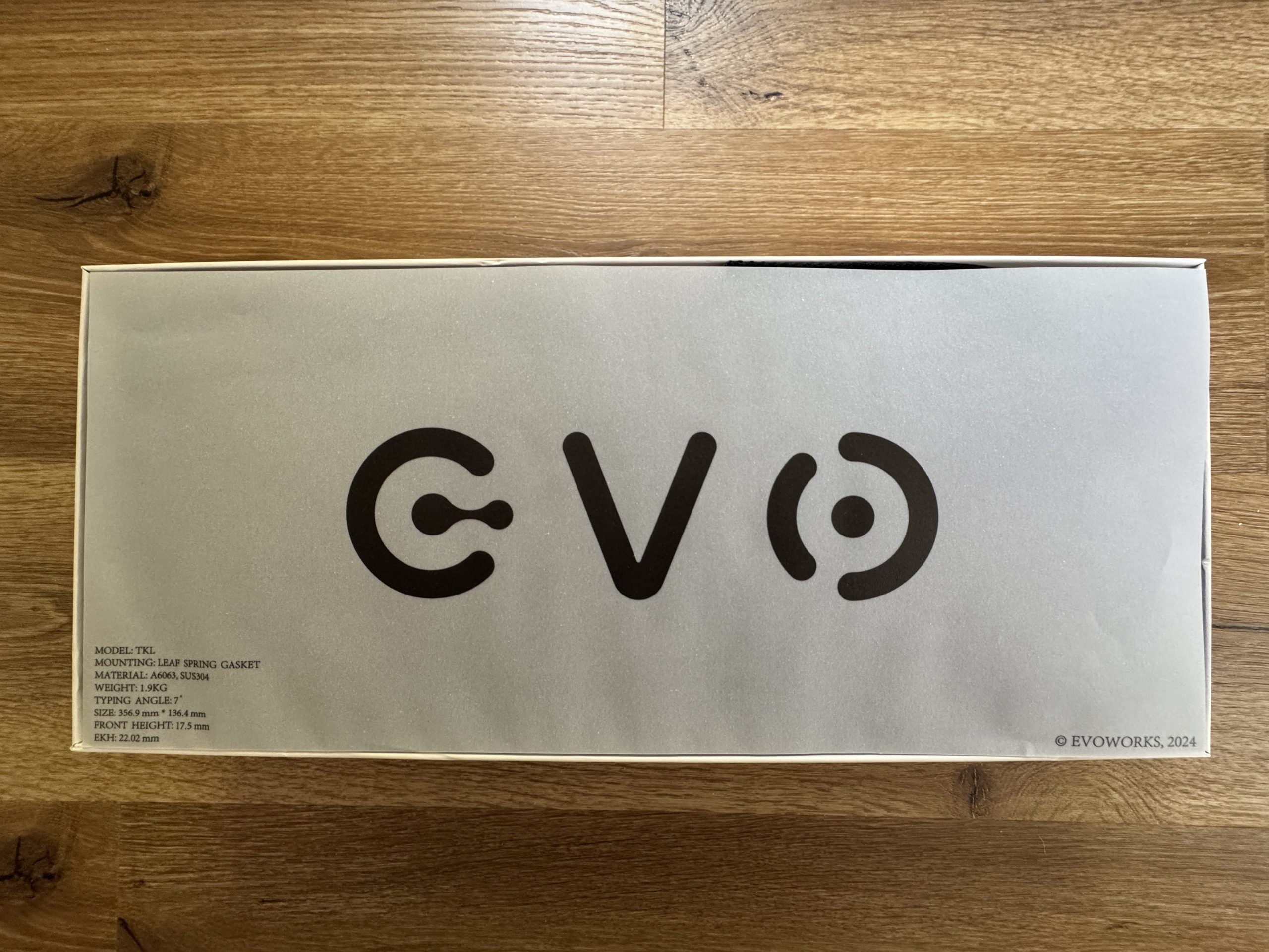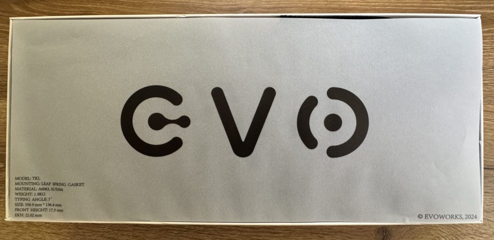 You can see the opened packaging of the Qwertykeys Evo 80. Immediately after opening, there is a white sheet with the large lettering “EVO” printed in black typography on top. The key technical data for the keyboard is printed on the bottom left of this sheet: Model TKL, Mounting Leaf Spring Gasket, material 6063 aluminum and SUS304 steel, weight 1.9 kilograms, typing angle 7 degrees, dimensions 357 × 136.4 millimeters, front height 17.5 millimeters and EKH 22.02 millimeters. The marking “© Evoworks, 2024” can be seen at the bottom right. This insert looks like a specification card that gives the buyer an overview of the board’s most important data the first time they open it.