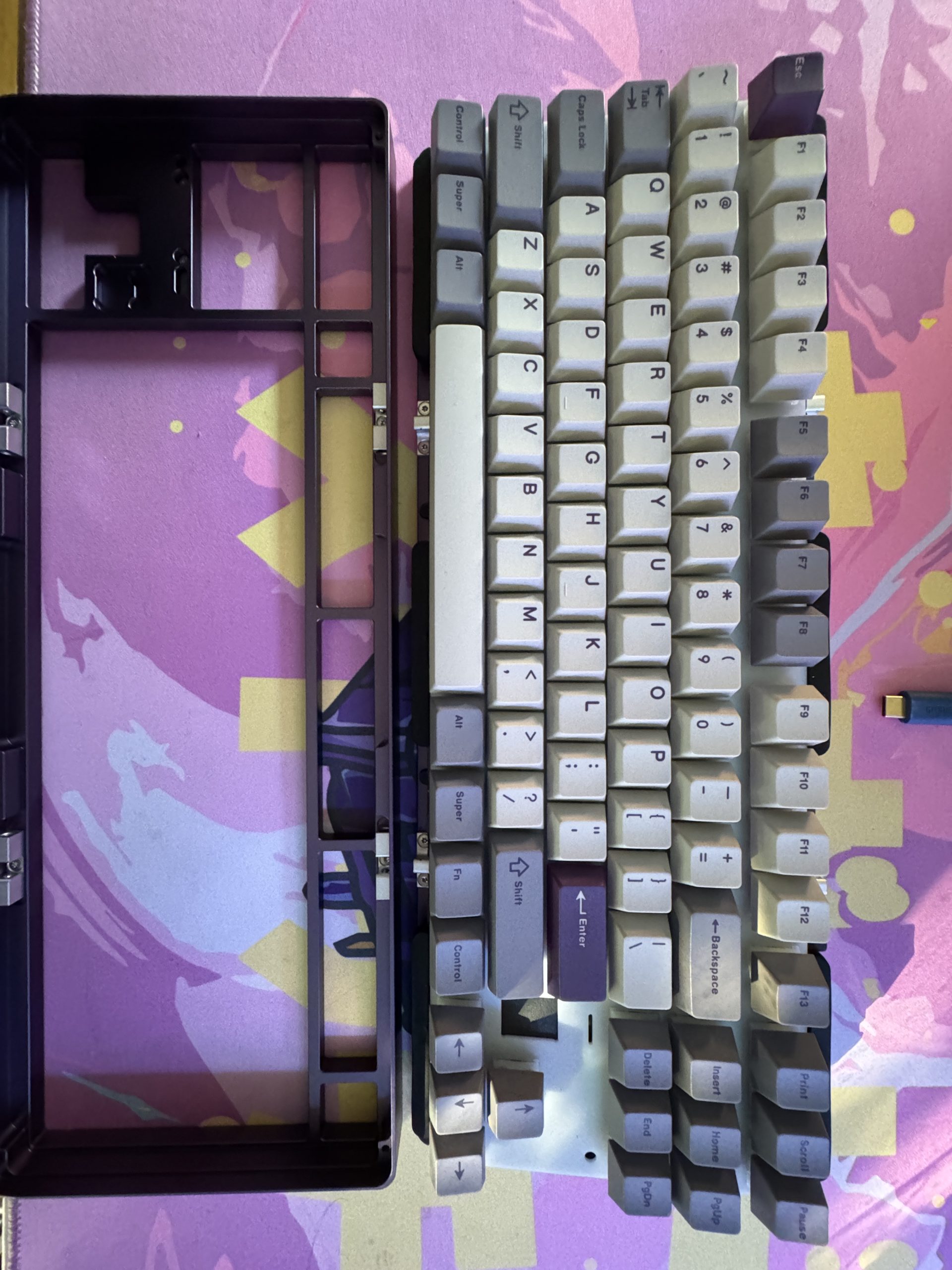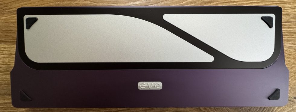 The underside of the keyboard in the “Tyrian” color variant, in a rich purple hue. The back consists of a sturdy aluminum housing with a large silver accent plate divided into two diagonal segments. At the bottom center is a small metal emblem embossed with “EVO”. There are black, triangular rubber feet at the four corners to ensure non-slip stability. The interplay between the dark Tyrian shade and the light metal plate gives the back an elegant yet modern look. I would have liked the EVO plate to be engraved. But it’s all good!