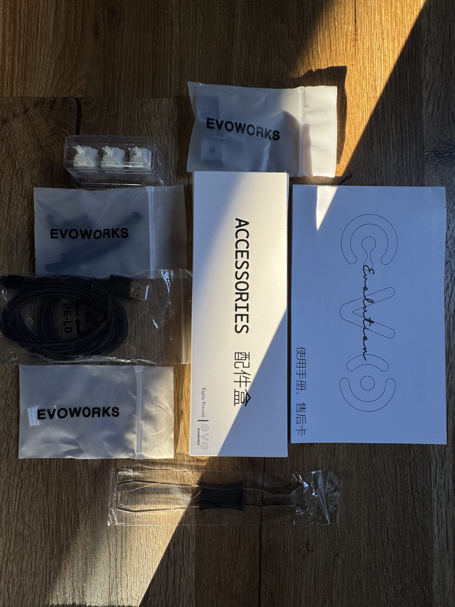 The accessories for the Qwertykeys Evo 80 have been carefully put together and cover all the important points for use and care. Included are three spare switches in a small transparent box, several small bags labeled “EVOWORKS”, which contain additional small parts such as screws or damping elements, as well as a braided USB-C cable for wired operation. There is also a white box labeled “ACCESSORIES”, which contains some of the accessories. And a printed manual including a warranty card with a simple Evo design. The package is rounded off with a black keycap puller, which can be used to safely remove keycaps. Everything you need for spare parts, connectivity, adjustments and the first steps on the new board is therefore included.