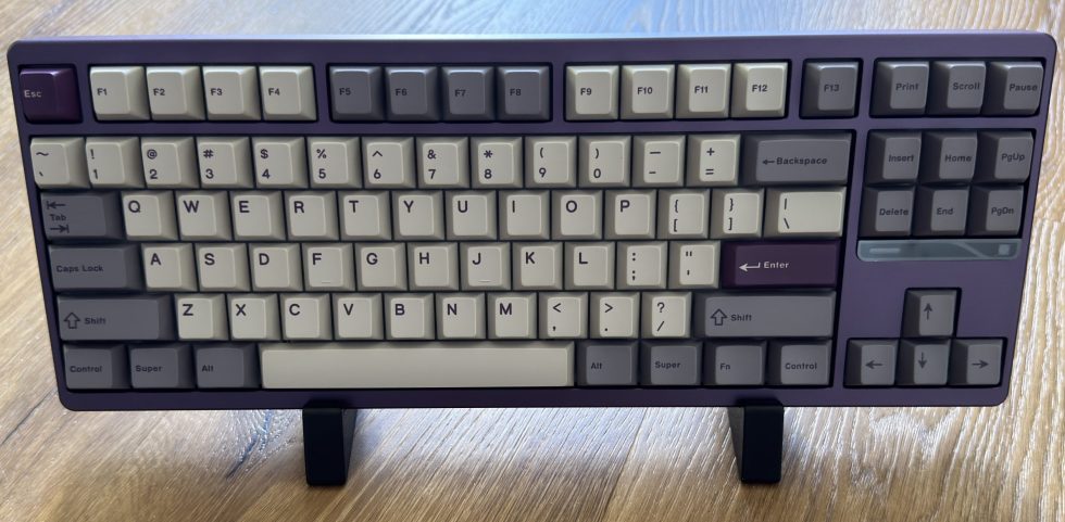 The top of the Qwertykeys Evo 80 in full view. The housing is also in Tyrian and combined with a set of two-tone keycaps in the classic Cherry profile. The keys are designed in a mix of light cream tones and darker shades of gray, creating a restrained but elegant overall impression. Individual keys in Tyrian purple, including the Escape key and the Enter key, provide accents. The layout is a TKL design with a row of function keys and a separate block for navigation keys, but without a numeric keypad. The workmanship is of high quality and the color combination of the housing and keycaps harmonizes well with each other.
