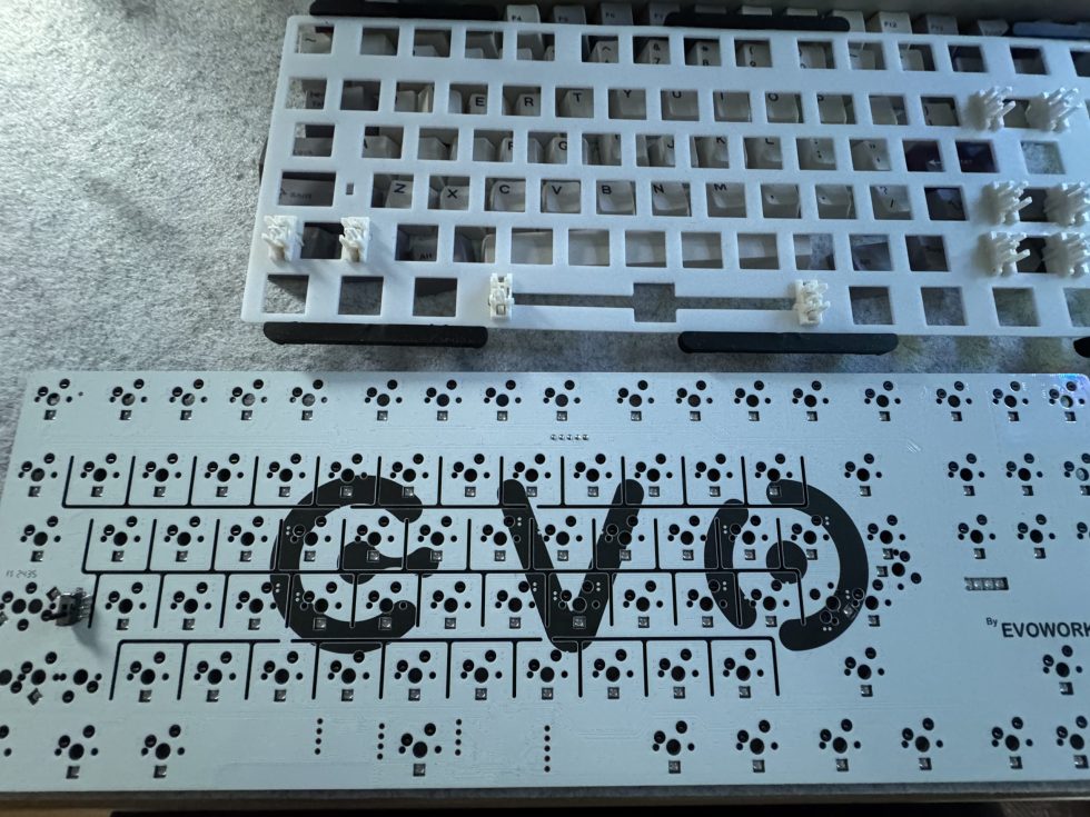 But the best thing about the housing comes now: You don’t need screws here. Instead, Qwertykeys uses a special mechanism that allows the parts to snap together precisely. This system ensures that the board is held together securely, but can also be opened again quickly if required, for example for maintenance or modifications. This creates a practical advantage: users do not have to reach for a screwdriver or tools, but can take the keyboard apart and put it back together again in just a few simple steps. And it is absolutely stable and secure. Furthermore, the PCB with the small circuit board does not need to be linked with a cable. It snaps into place magnetically and automatically. The same system as with Igor’s board. Absolutely brilliant!