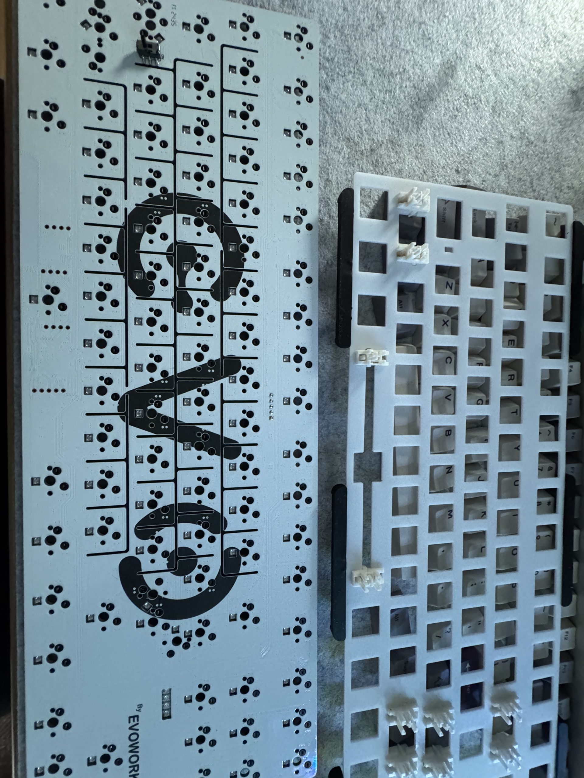 This is how the Flex-Cut PCB presents itself. It is immediately apparent that there are no cut-outs for conventional stabilizers, which means that only plate-mount variants can be used. This is a deliberate design decision that sets the board apart from other approaches. Personally, I would also have liked the option of using normal PCB-mount stabilizers. A variant in 1.6 mm without flex cuts would also have been interesting for me. In practice, however, this is not a disadvantage, but merely a point where I could have imagined an alternative implementation. On the left under the caps button, you can also see the small switch for the wireless function.