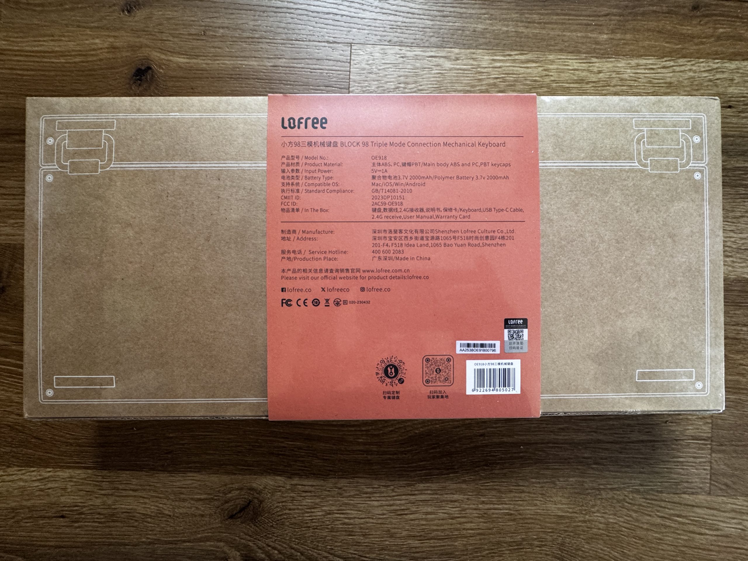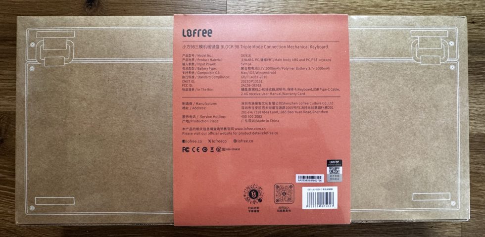 The back of the packaging shows a brown cardboard box with fine white lines that schematically represent the keyboard. In the middle is a red sticker with technical details, manufacturer information and the scope of delivery.