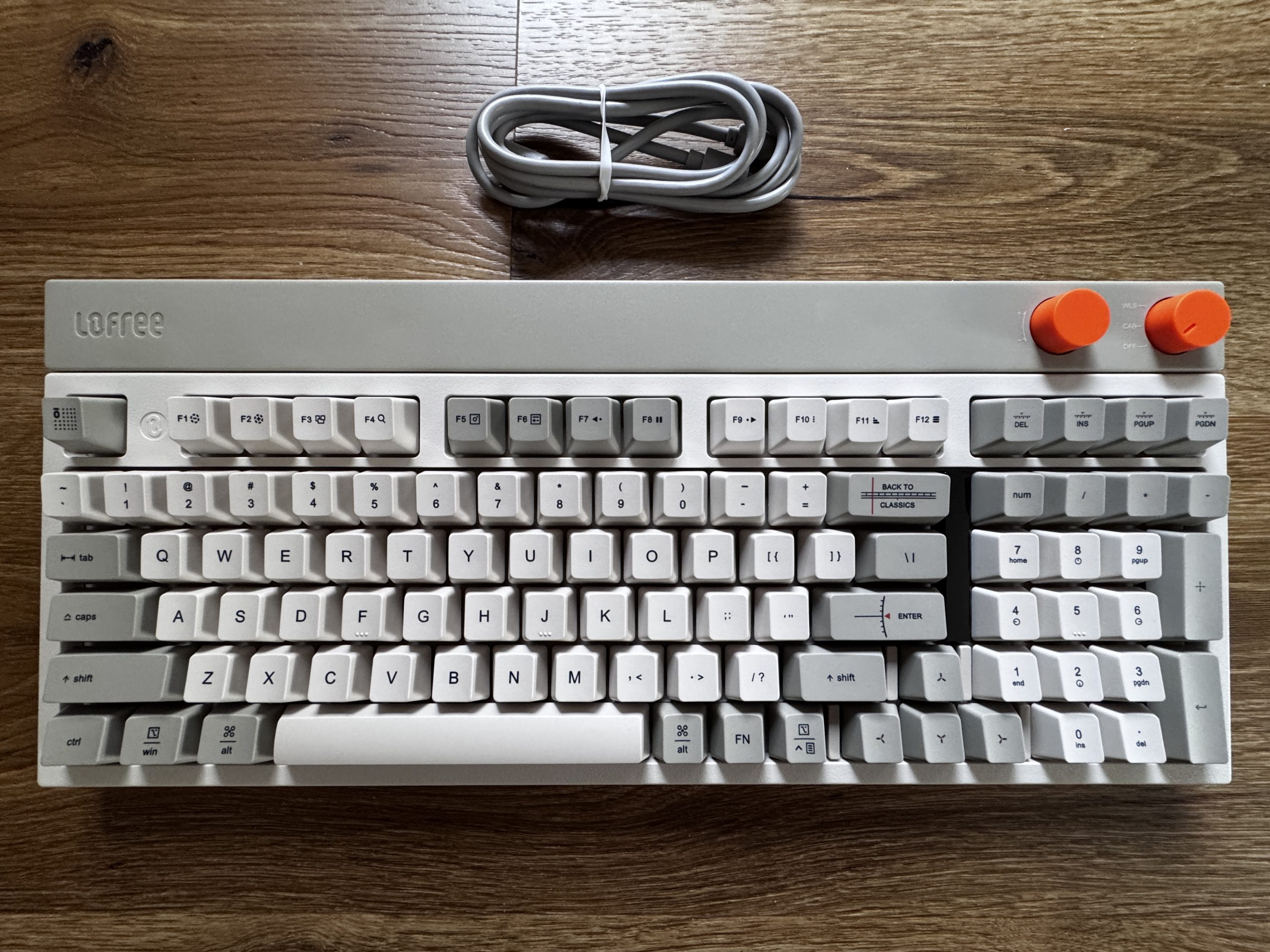 The top shows the complete layout with 98 keys in various shades of gray, creating a calm, clear overall impression. The main keys are kept light, while certain functional areas are accentuated slightly darker. The two orange rotary knobs on the top right edge are striking, deliberately breaking up the minimalist color scheme and offering a retro-style user interface. The Lofree logo is embedded in the top left, and a neatly rolled-up USB-C cable is located above the keyboard. The overall impression is structured, tidy and visually reminiscent of classic input devices from past decades.