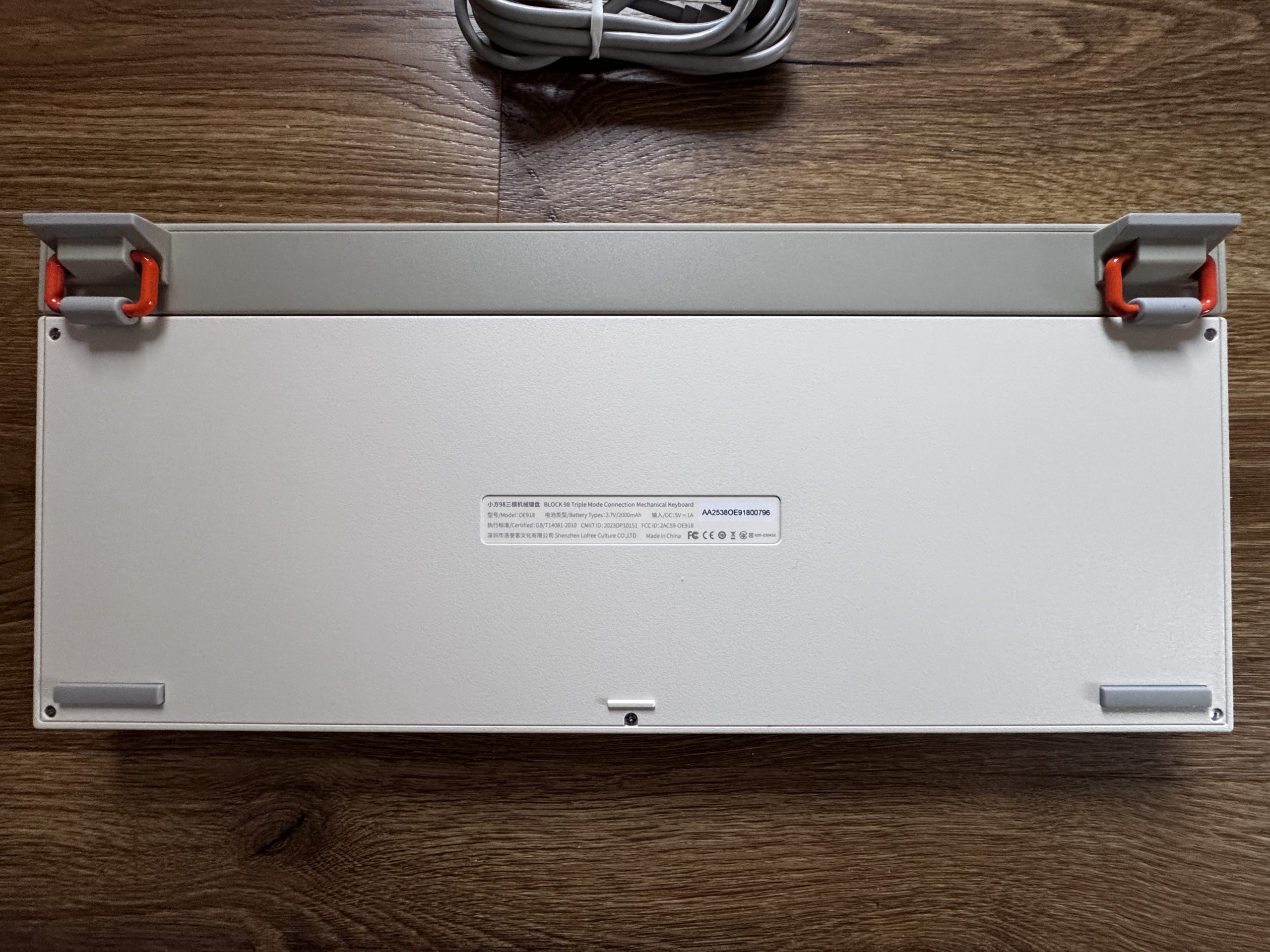 The underside of the keyboard has a bright, matt plastic casing with a slightly textured surface. Two fold-out feet on the top edge create a clear accent, as they are in gray and attached with striking orange joints. This construction provides stability and gives the design a functional, slightly industrial character. There is a narrow sticker in the middle with the model name, certifications and manufacturer information. There are flat rubber pads at the four corners, which are designed for a secure stand and non-slip use on the table.